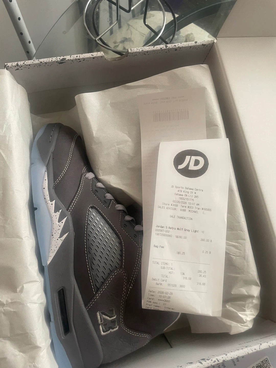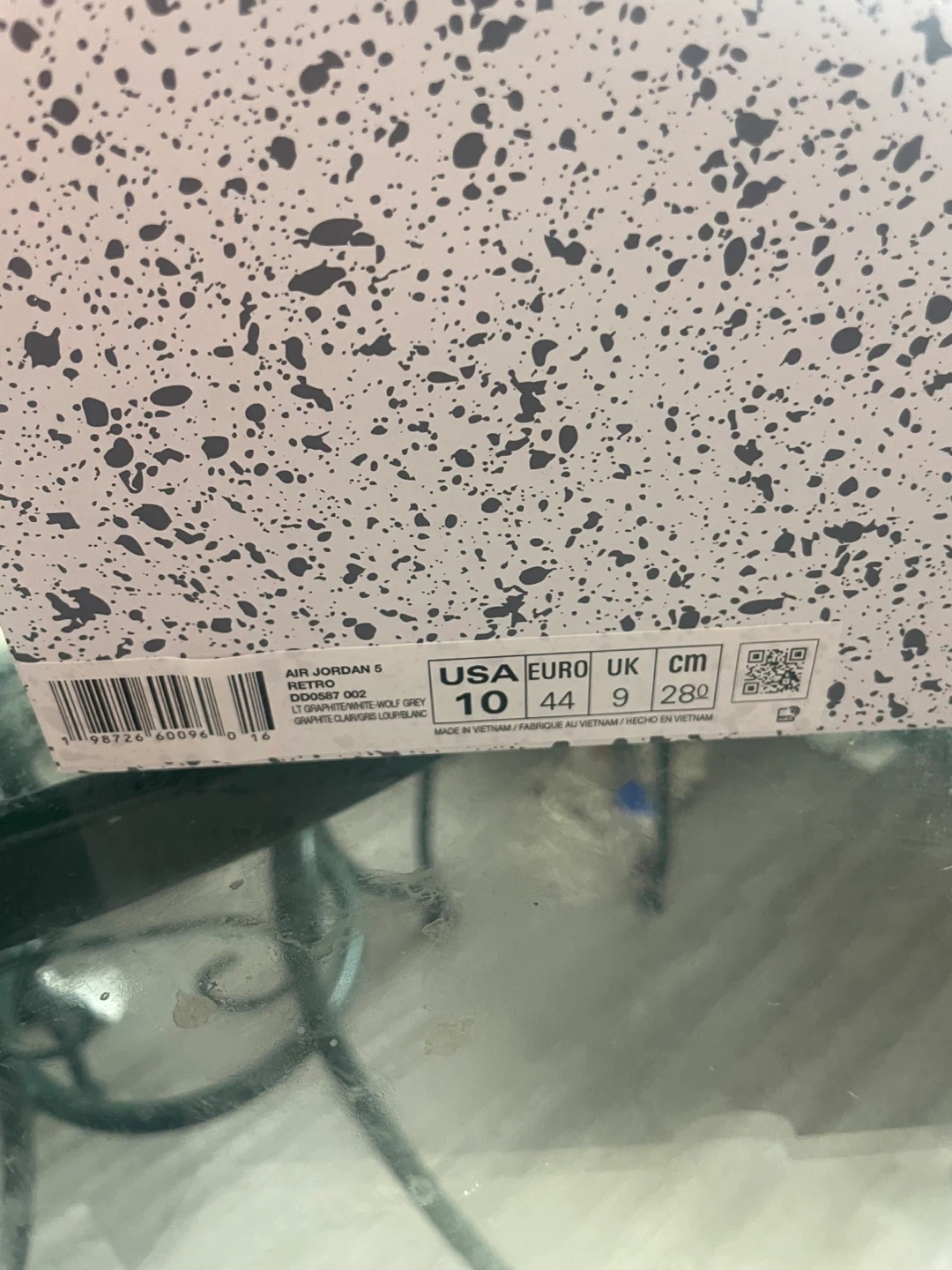These Air Jordan 5 Retro sneakers come in a cool Wolf Grey colourway. They're size 10 US, 9 UK, 44 EU, and 280 cm. Includes original box and tissue paper.