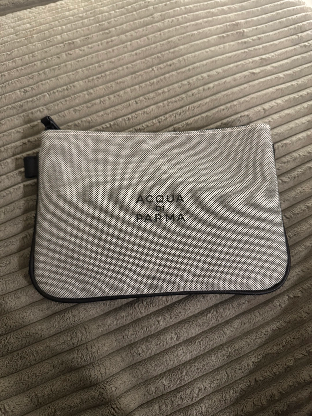 Selling this sleek Acqua di Parma pouch with a textured canvas finish and black trim. It has a really clean, understated look and feels durable but still lightweight.