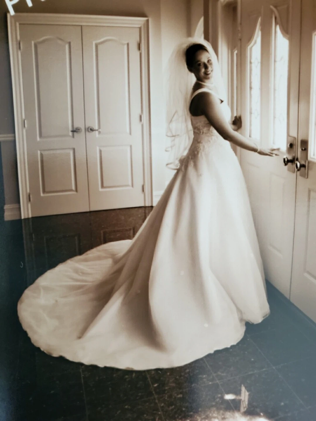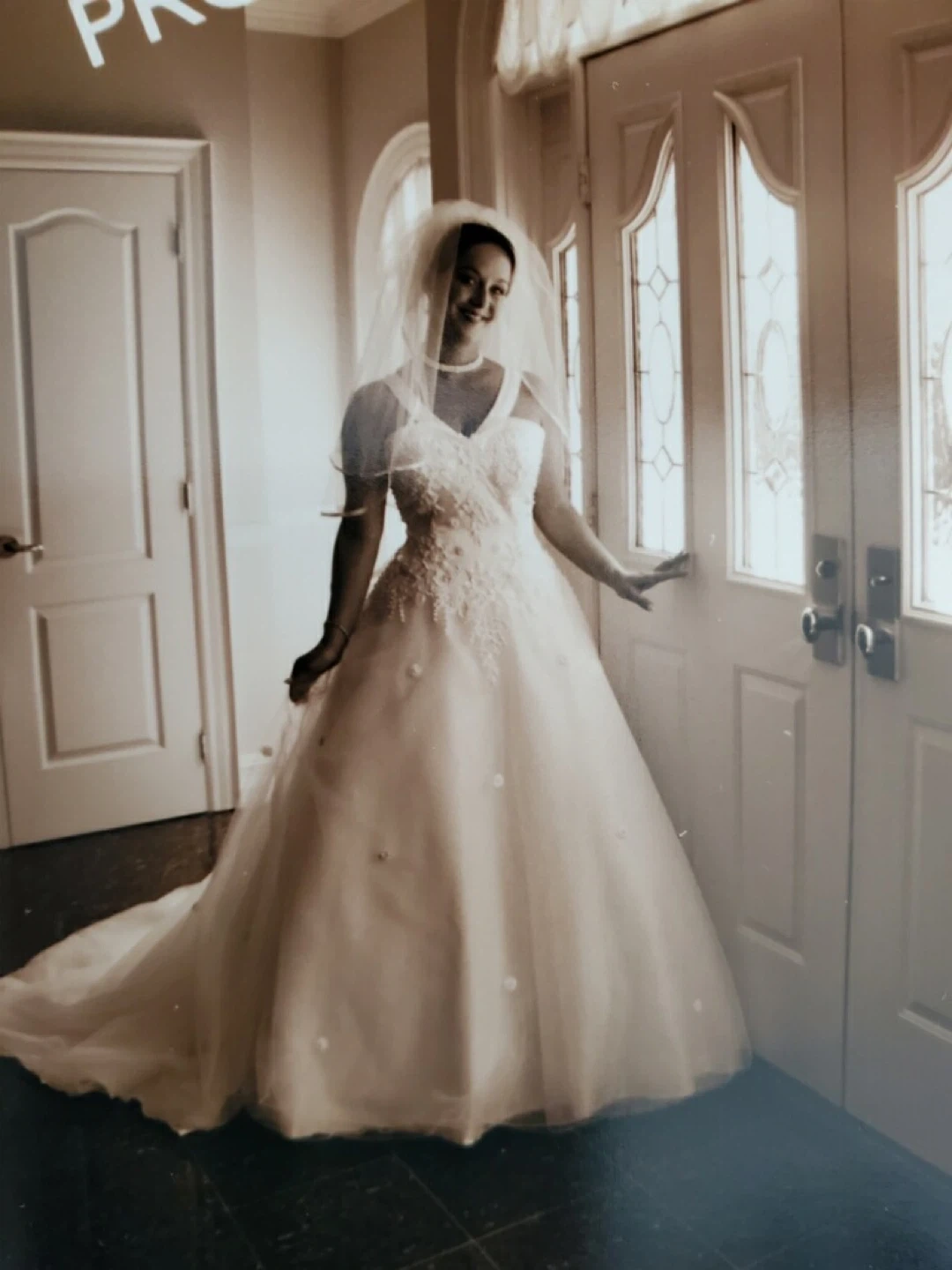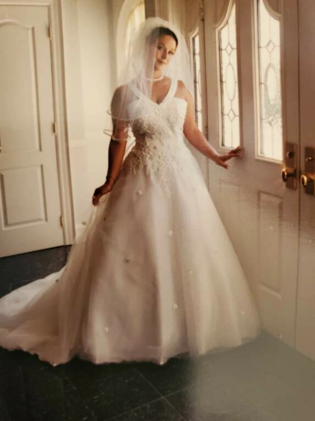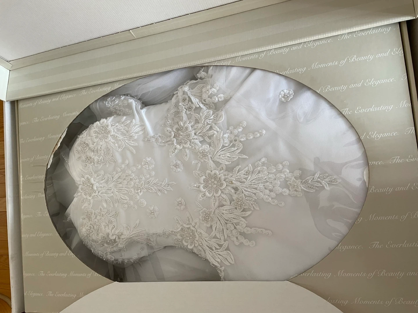 Beautiful white wedding dress with intricate lace and beading details. It features a classic A-line silhouette with a flowing train. Includes the original box for safekeeping. Perfect for your special day! Size 6/7 stored in museum wrap