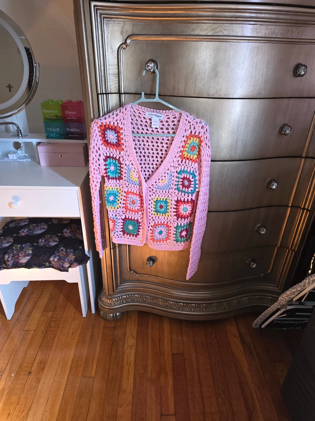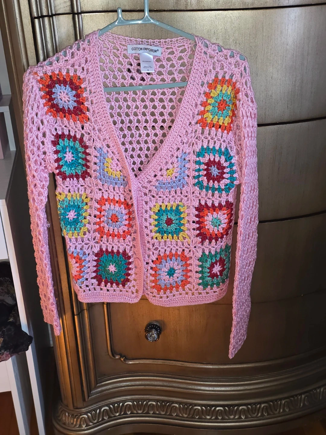 This pink crochet cardigan features a colorful granny square design. It's a V-neck style with long sleeves and a button front. Made from cotton. Pit to pit: 19" Length: 22"