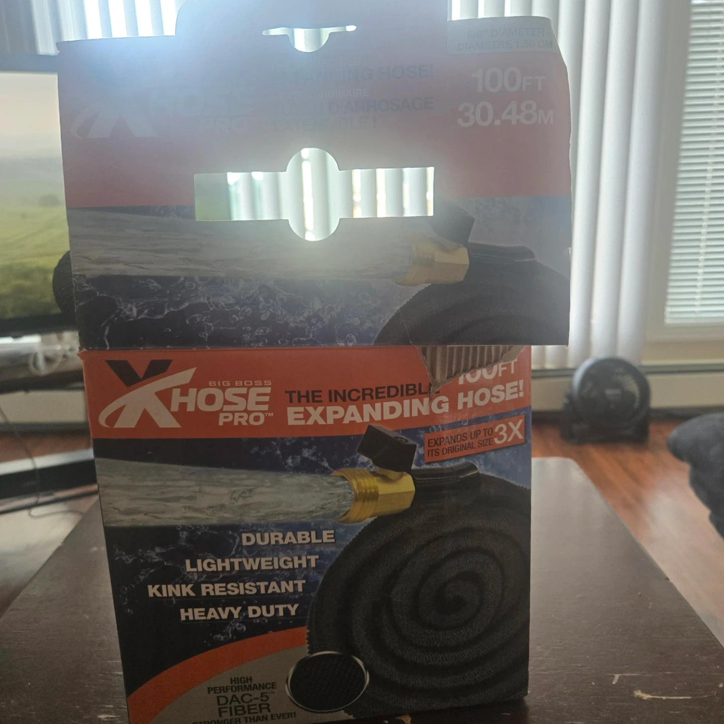 This is the Big Boss Pro X incredible expanding hose. It's 100ft long and expands up to 3x its original size. The hose is durable, lightweight, kink resistant, and heavy duty.