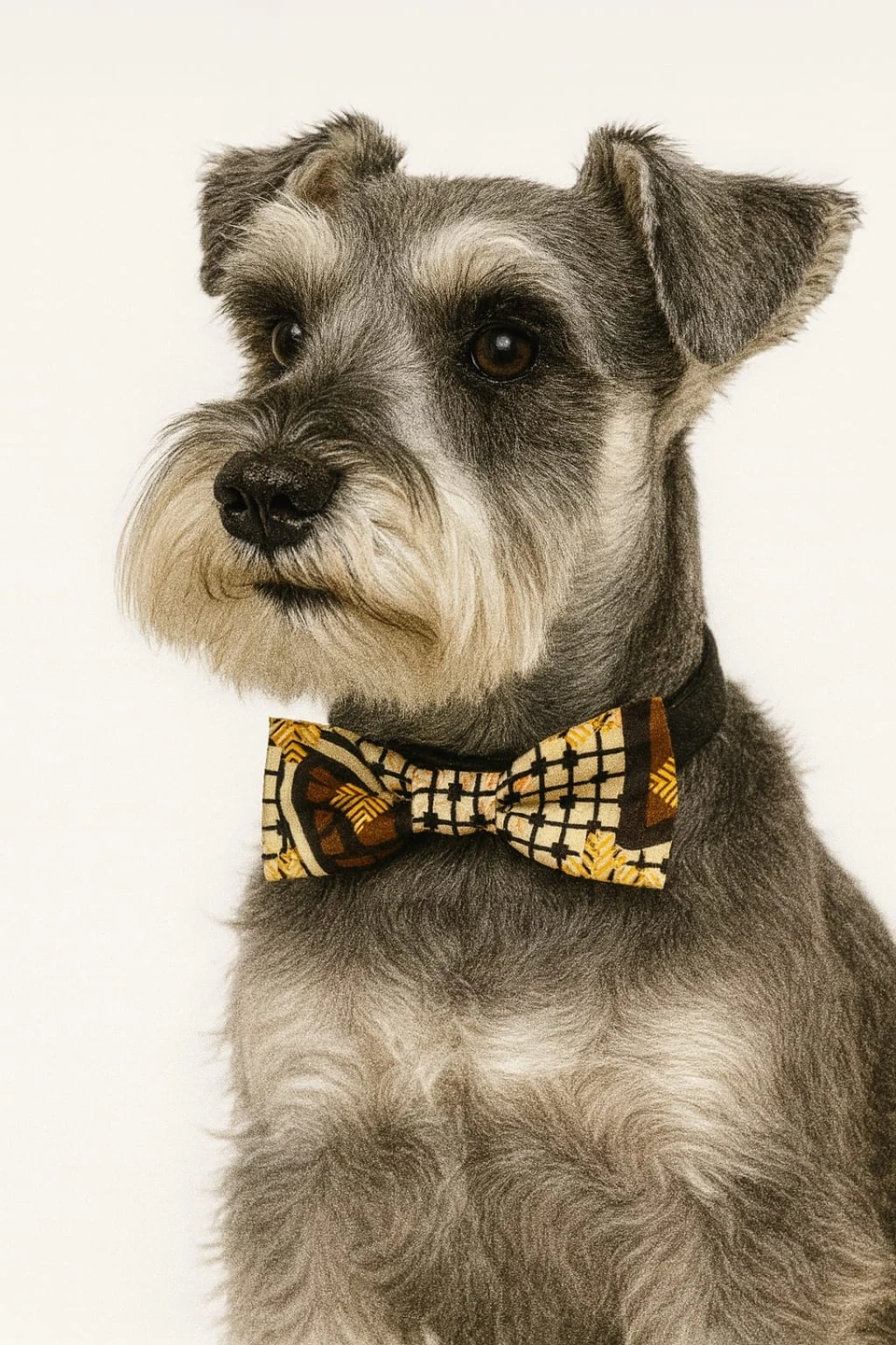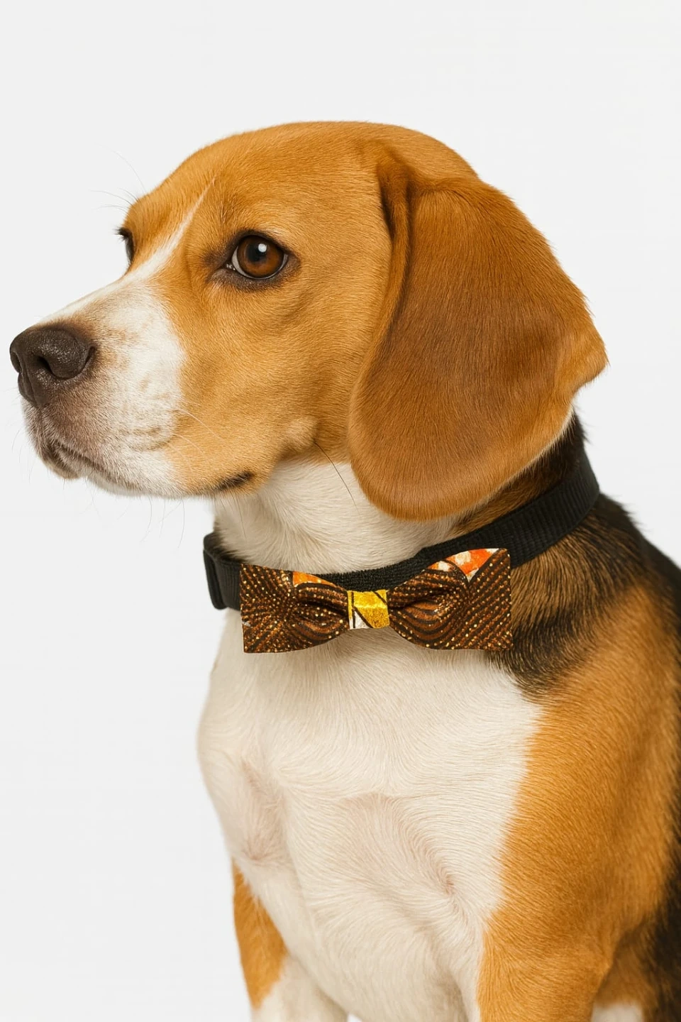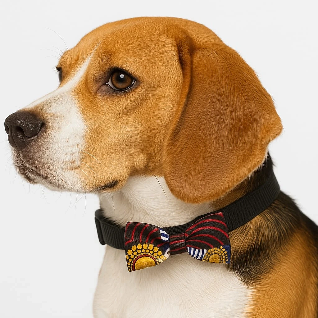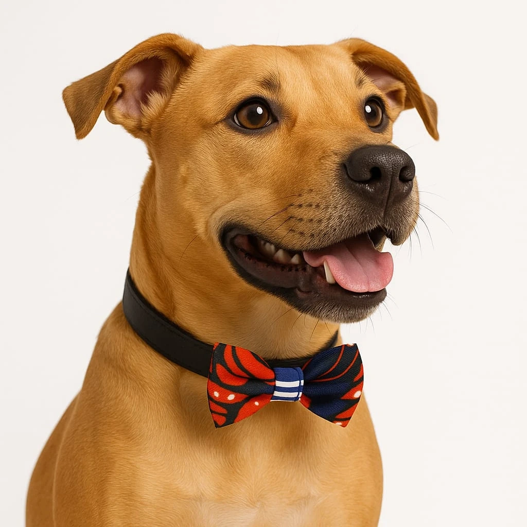 A collection of decorative bow ties designed to be attached to a dog's collar. They come in various patterns and colours to add a touch of style. Each bow tie is made of fabric and includes a small loop on the back for collar attachment.