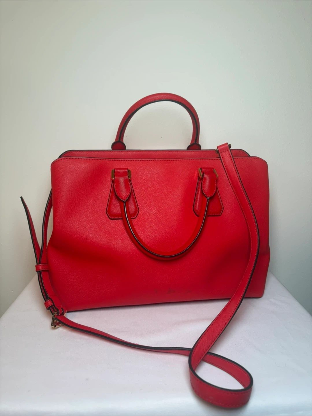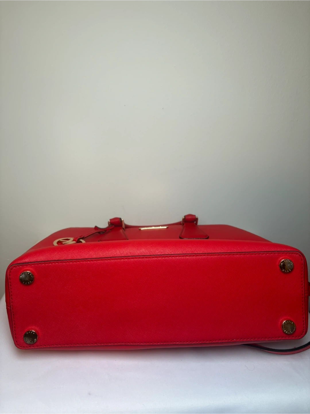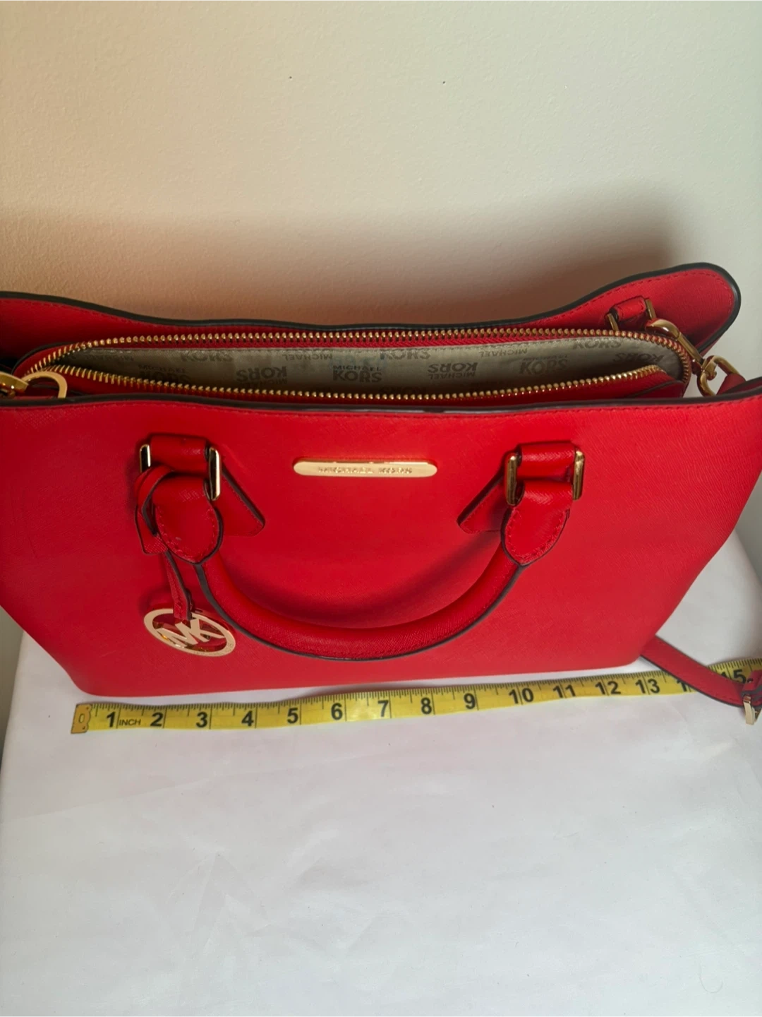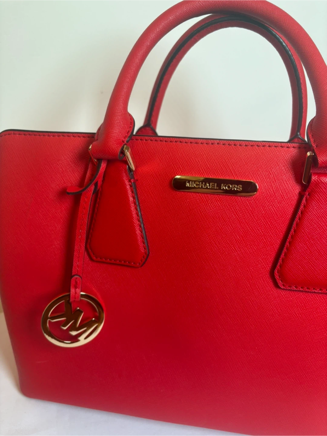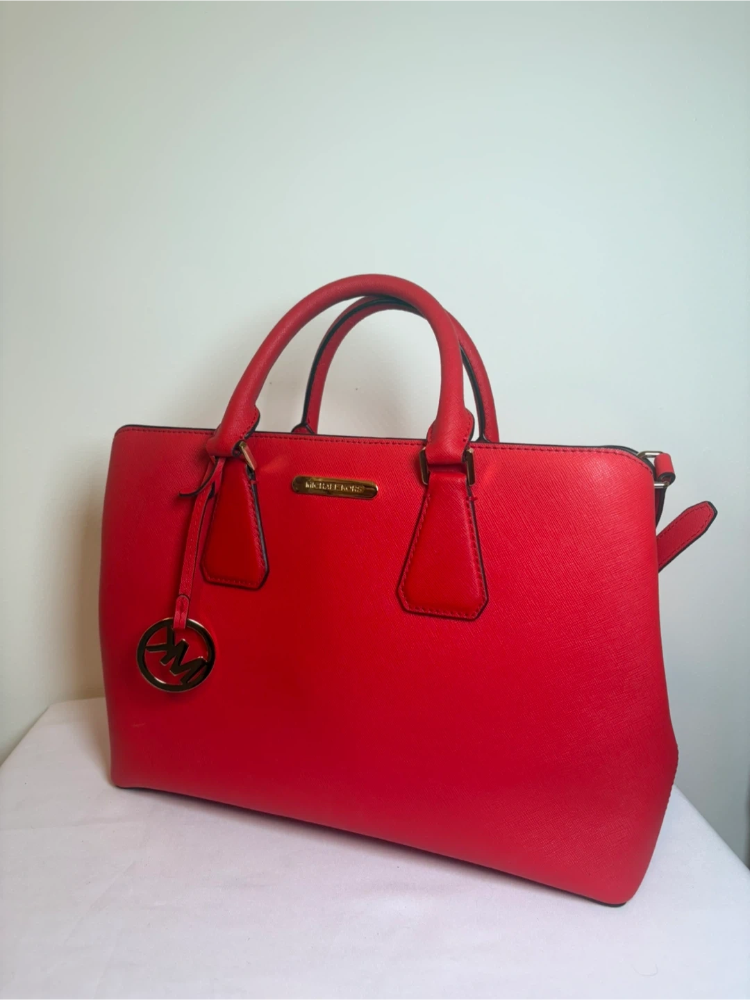 This is a classic red Michael Kors handbag. It's made from durable Saffiano leather and features a detachable shoulder strap. It's the perfect size for everyday essentials!