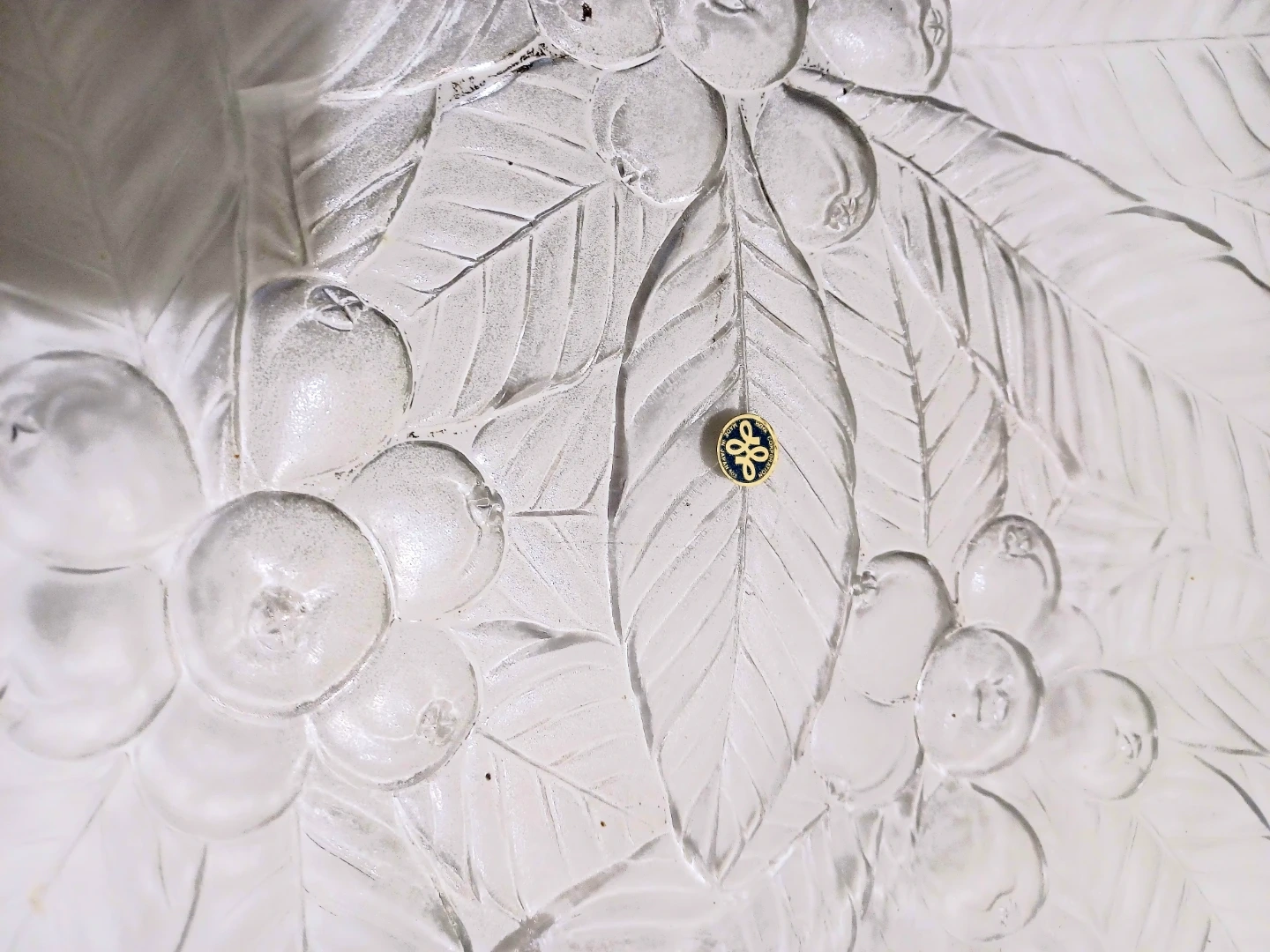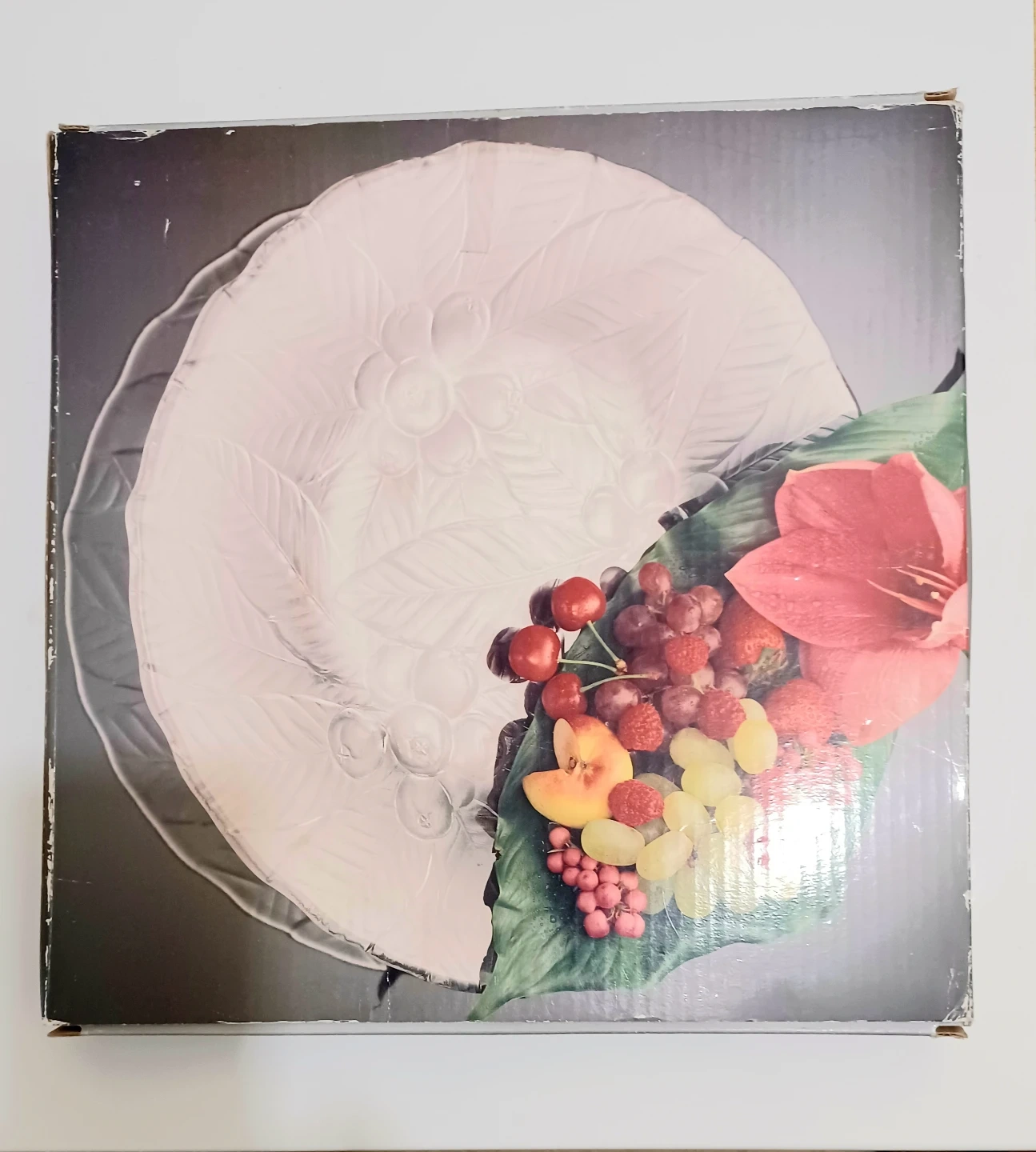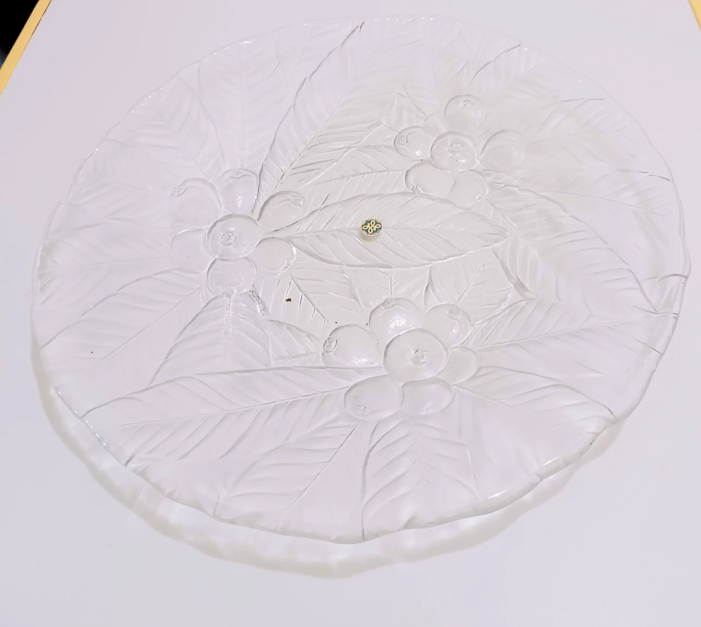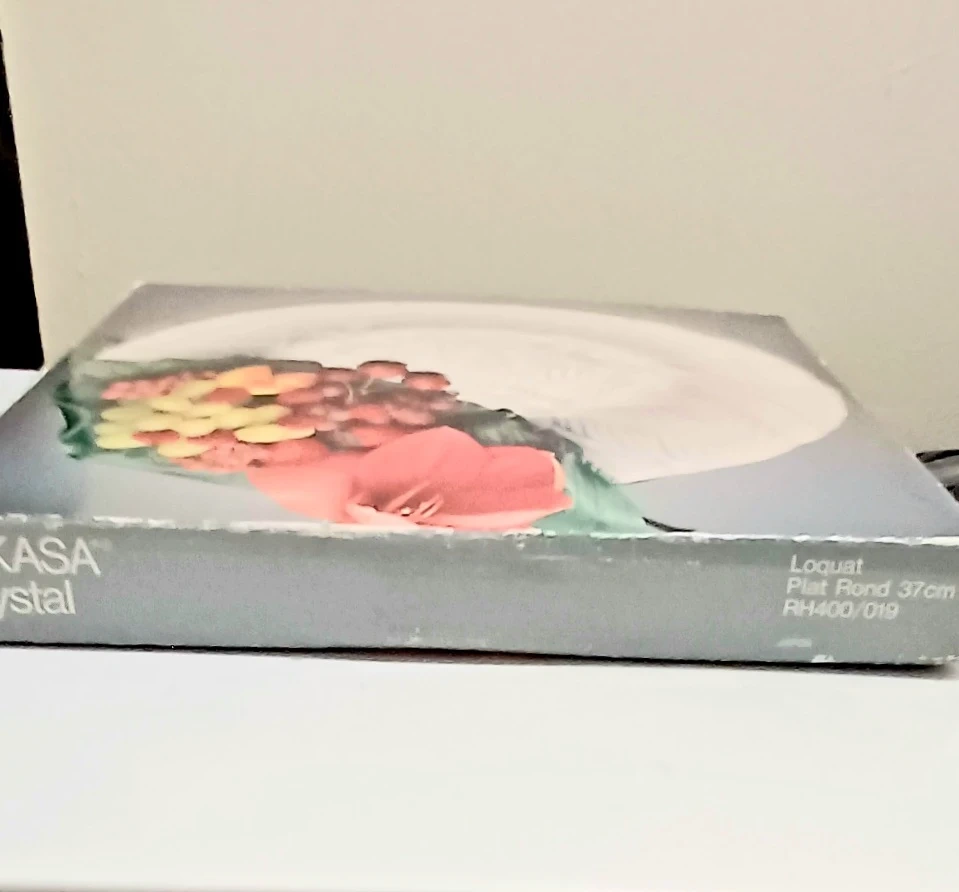 Add a touch of elegance to your dining experience with this Mikasa 'Loquat' crystal buffet platter, measuring 14 inches in diameter. The platter features a beautiful floral and leaf design, perfect for showcasing your culinary creations. This item is in New condition, with Sticker & Original box.