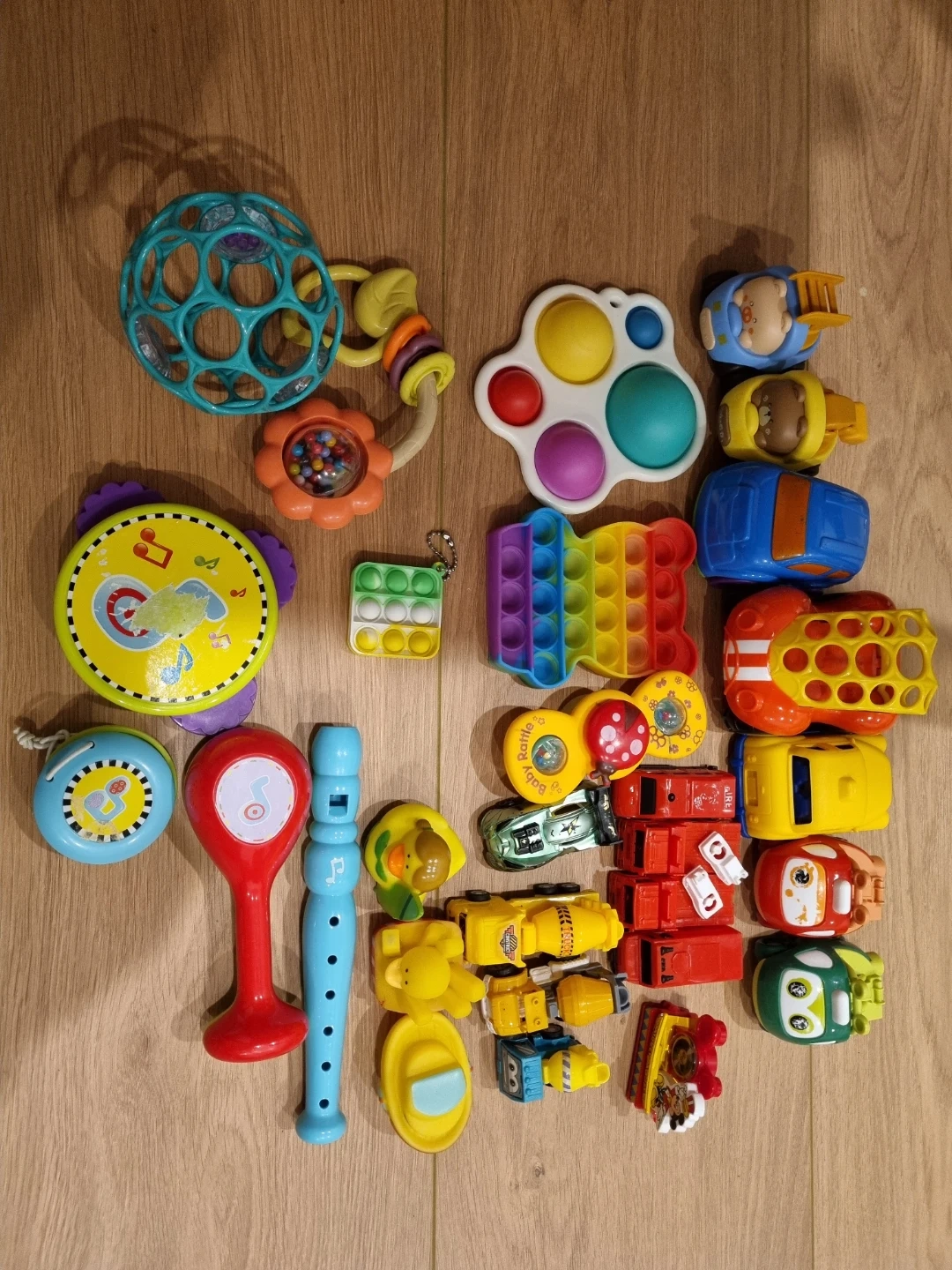 Selling a mixed lot of baby and kids toys. Includes rattles, pop-its, toy cars, and other fun items! Perfect for keeping little ones entertained. Some have visible wear but everything in working condition.