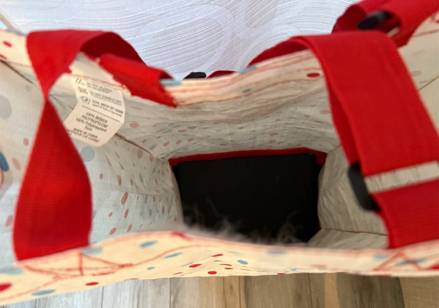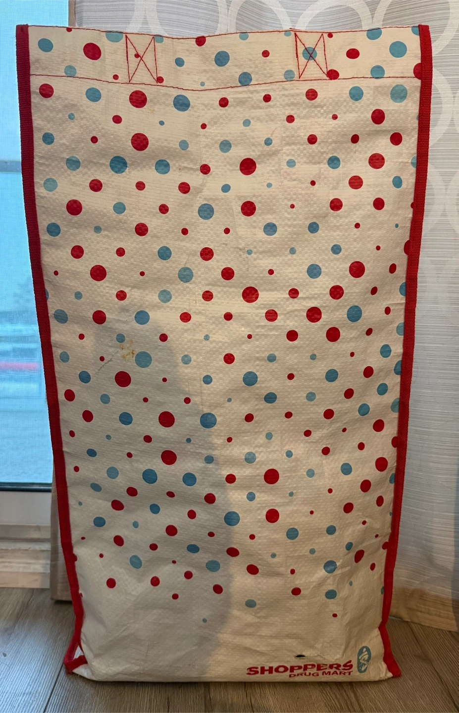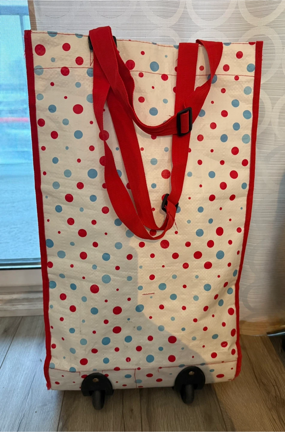 This reusable rolling shopping bag has a red and blue polka dot pattern. It's made from 100% woven polypropylene. It's great for carrying groceries or other items!