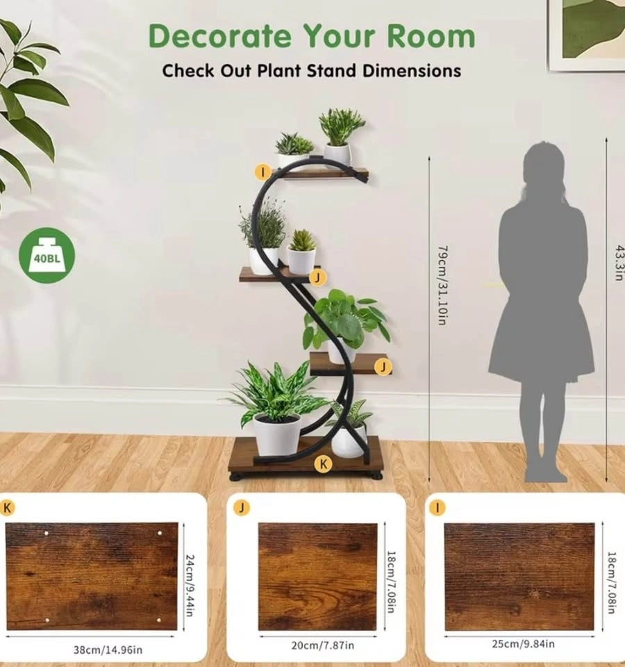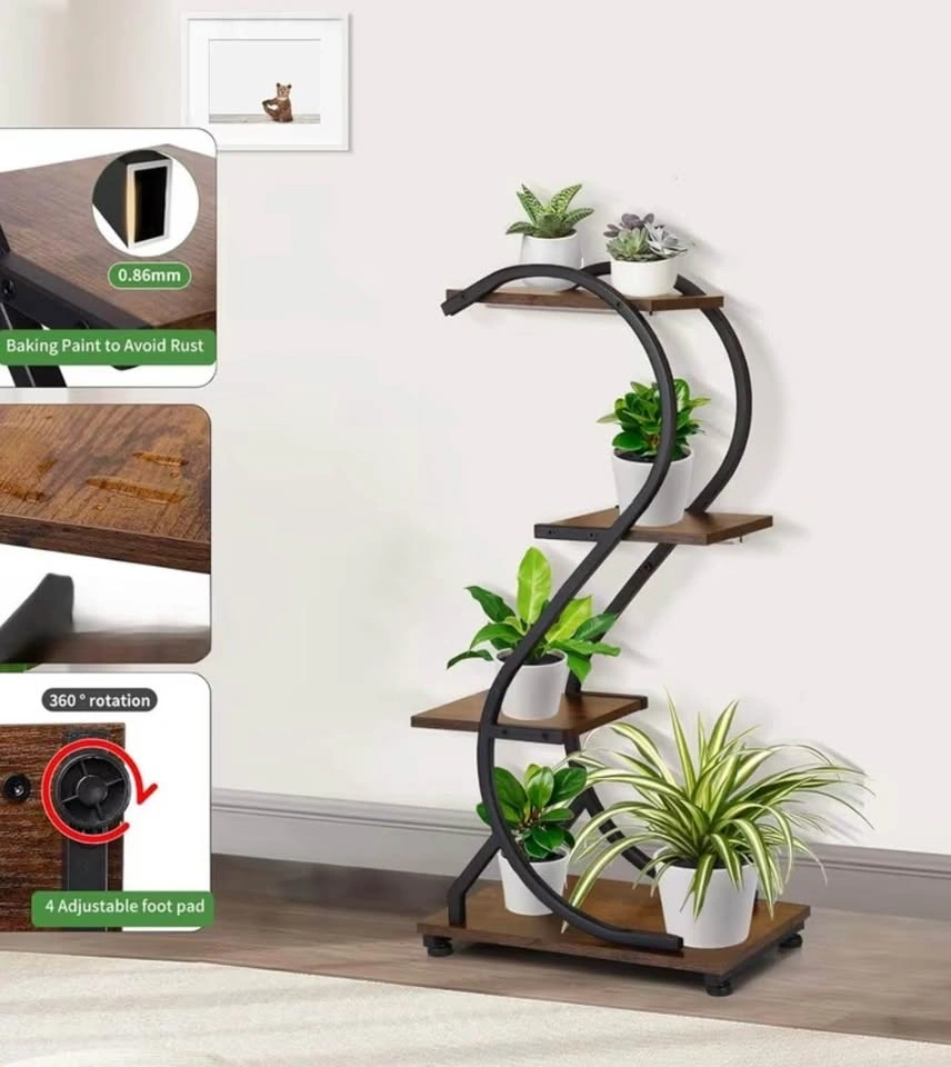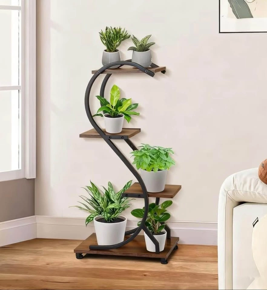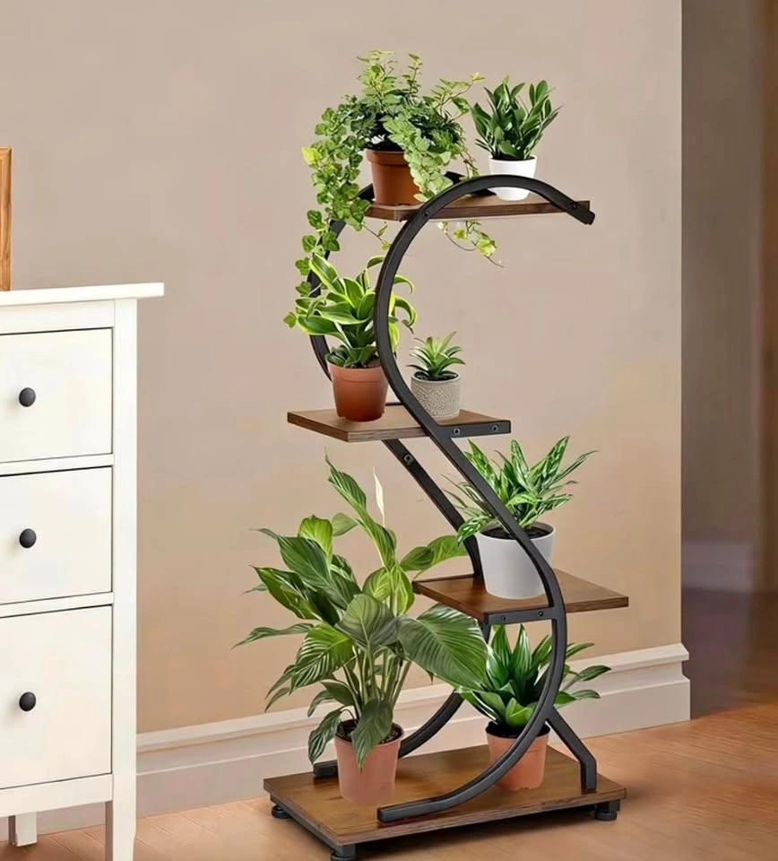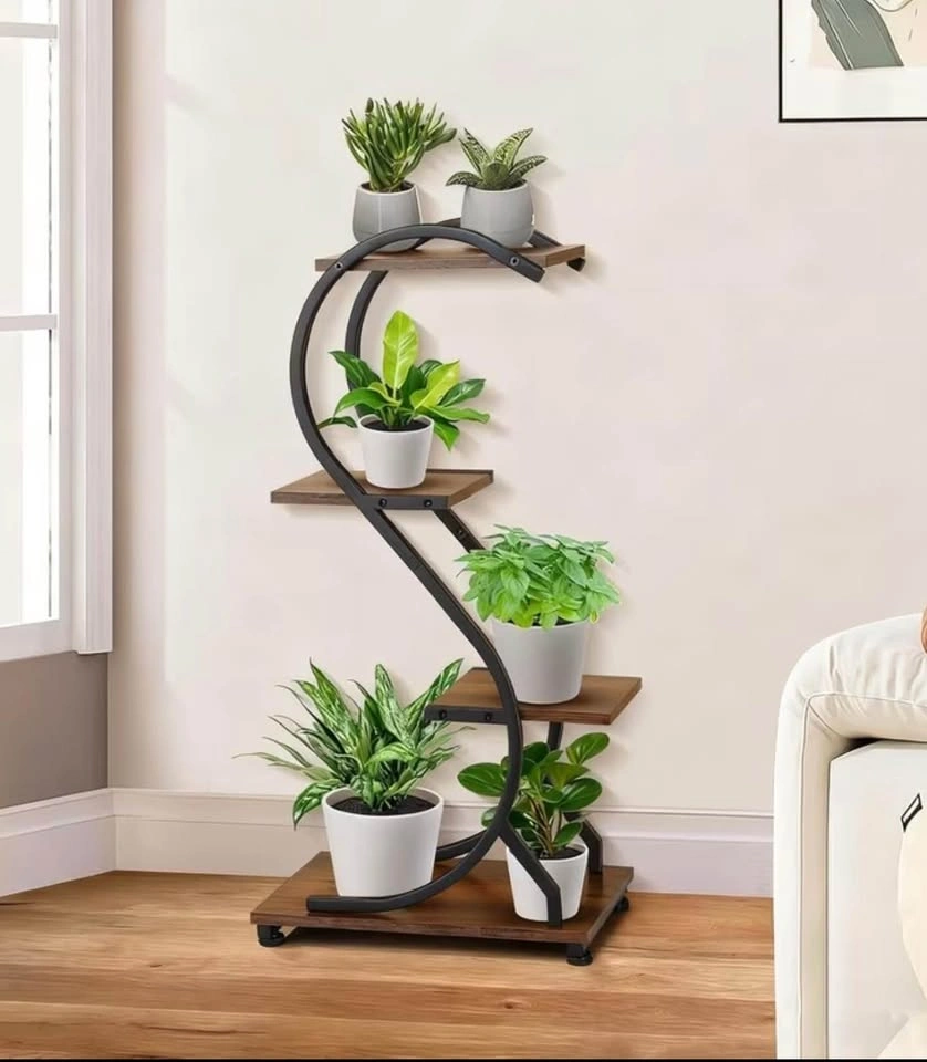 This indoor plant display stand is a great option for adding some greenery to your home. The compact, multi-level design is perfect for small spaces like apartments or condos. Made of sturdy wrought iron, it has a stylish look that can complement any room's décor. It's versatile enough to be used indoors or outdoors on a patio or balcony.