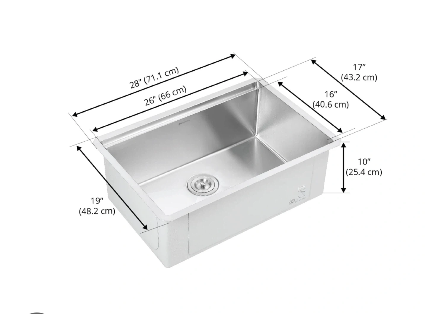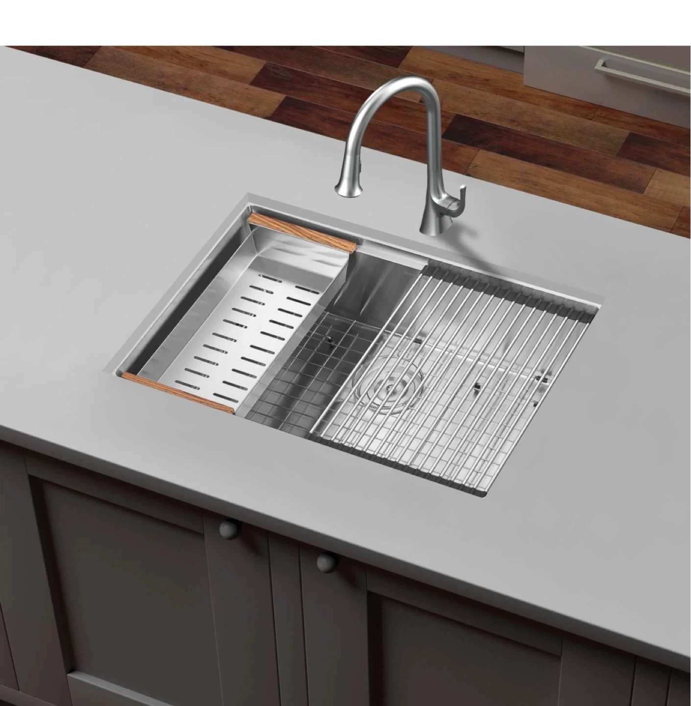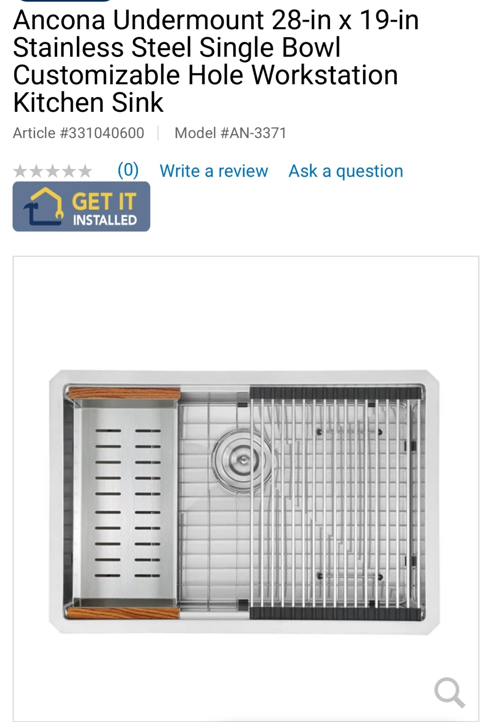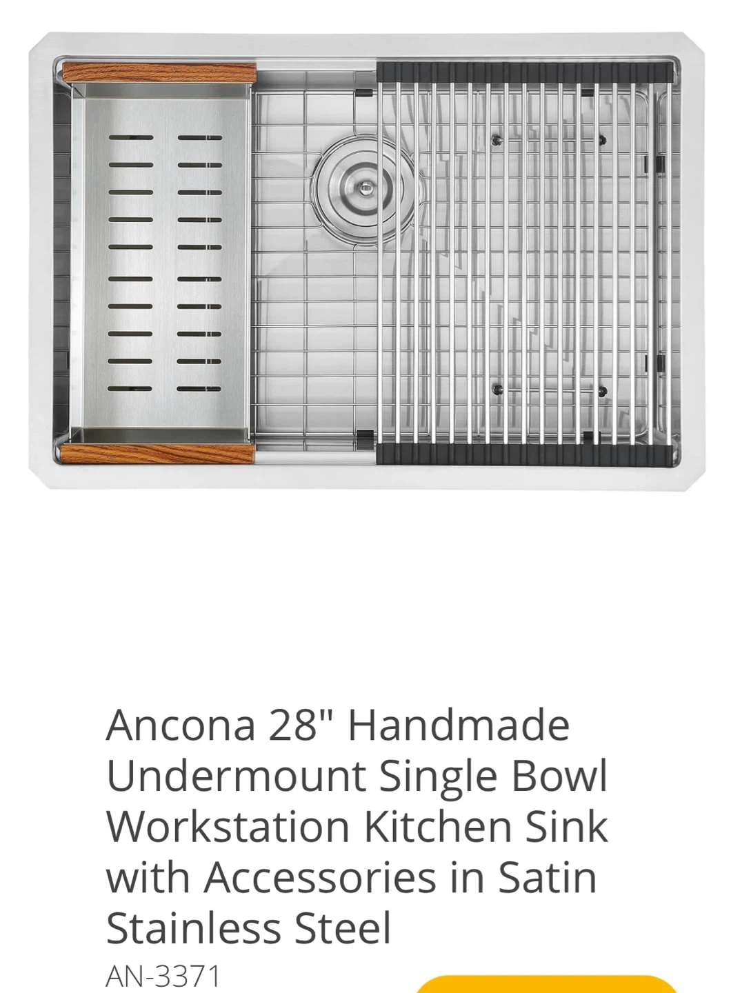 An Ancona 28" handmade undermount single bowl workstation kitchen sink. It's constructed from satin stainless steel and includes a wooden cutting board and a roll-up drying rack. This sink is designed to maximize kitchen workspace!