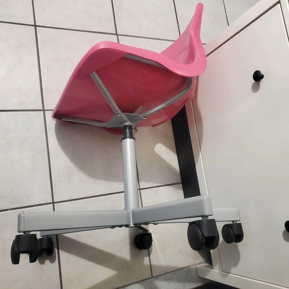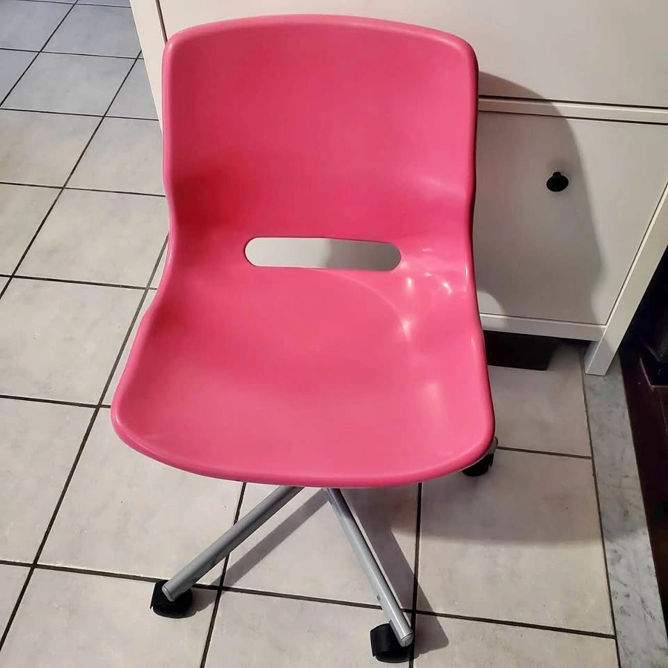 Ikea SNILLE swivel height adjustable chair. It's perfect for a kid's room or any space that needs a pop of color. It is in good condition, but the roller wheels need to be lubricated as they don't turn easily. Priced accordingly. Features: Swivel base for easy movement, adjustable height to suit different users, compact design, ideal for small spaces.