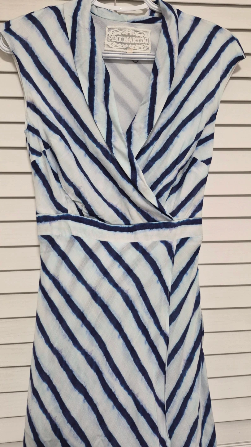 A stylish Piaza Marti sleeveless maxi dress with a navy and white diagonal stripe pattern. It features a flattering faux-wrap V-neckline and a cinched waist. Perfect for warm weather occasions!