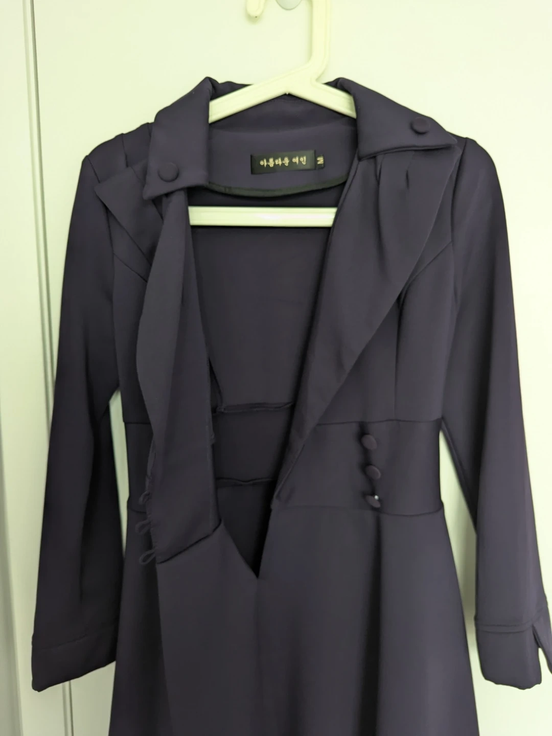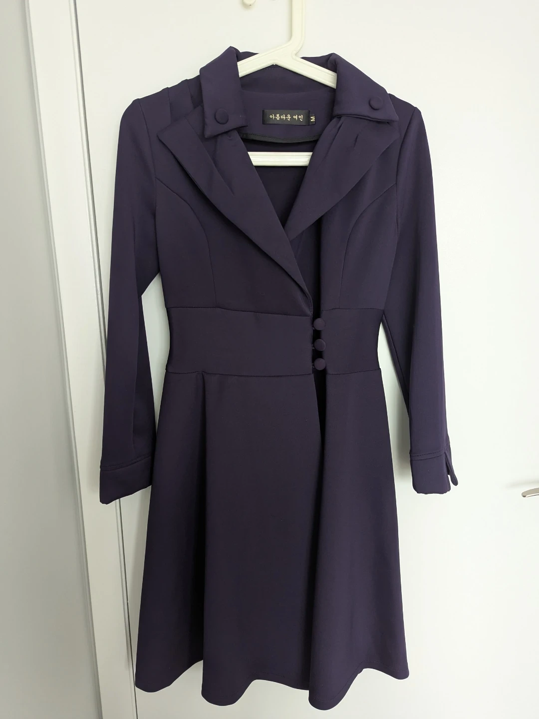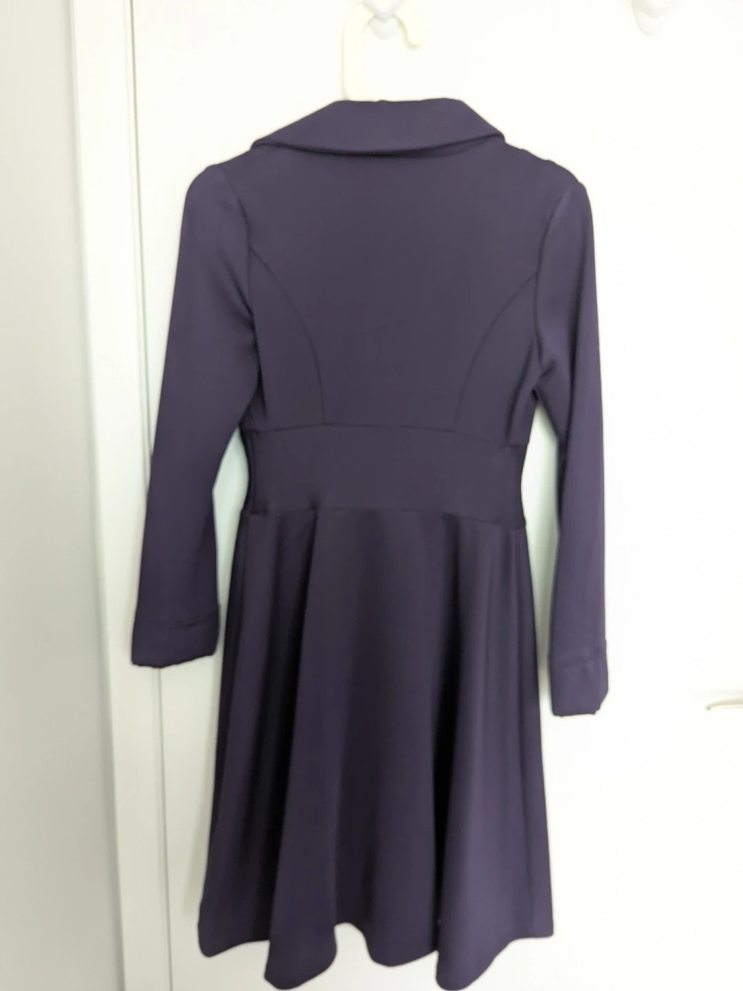 This is a stylish purple blazer dress with a flattering fit and button details. It's made from a comfortable fabric suitable for various occasions. The dress features a notched lapel and a cinched waist, offering a sophisticated silhouette. Size medium.
