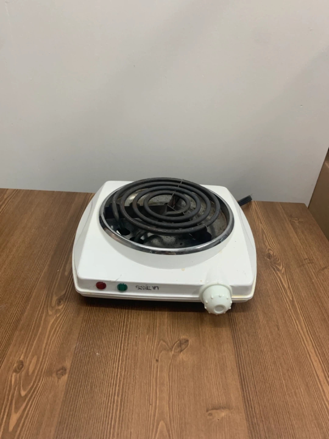 This is a white portable electric stove burner. It has one coil element for heating. The burner features a temperature control knob and indicator lights.