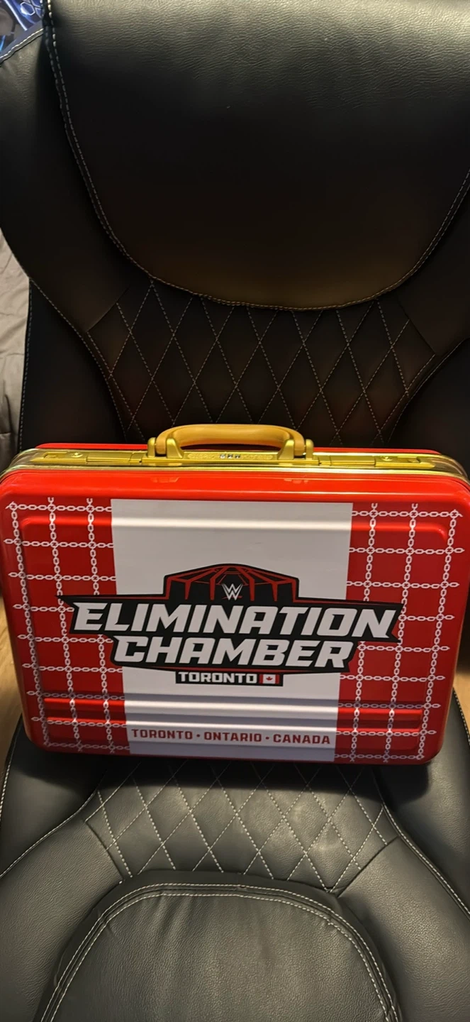 This is a WWE Elimination Chamber briefcase from Toronto, Ontario, Canada. It's red with white and silver accents, featuring the event logo. A great collectible for wrestling fans!