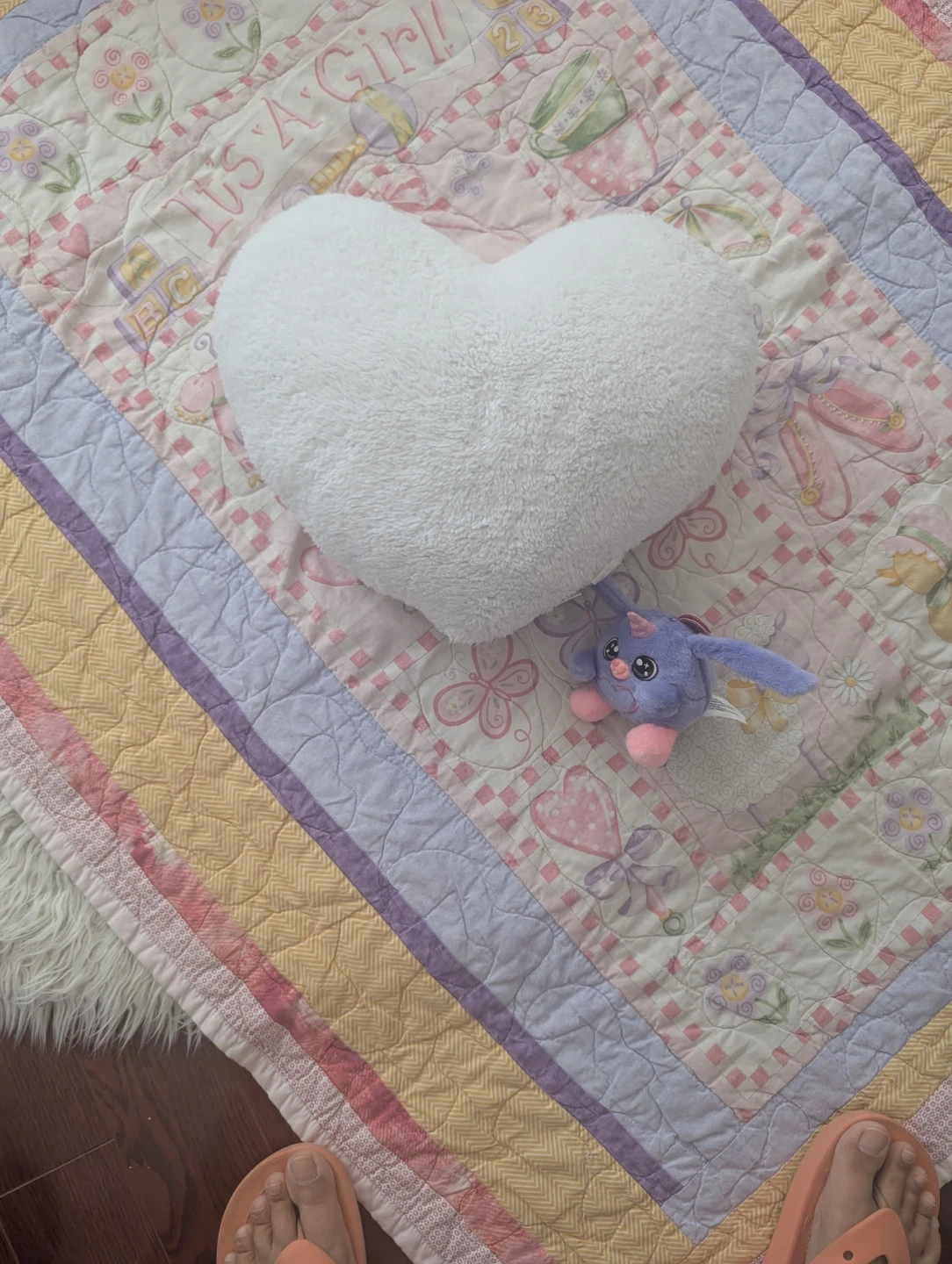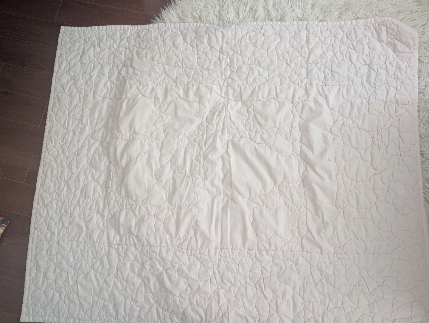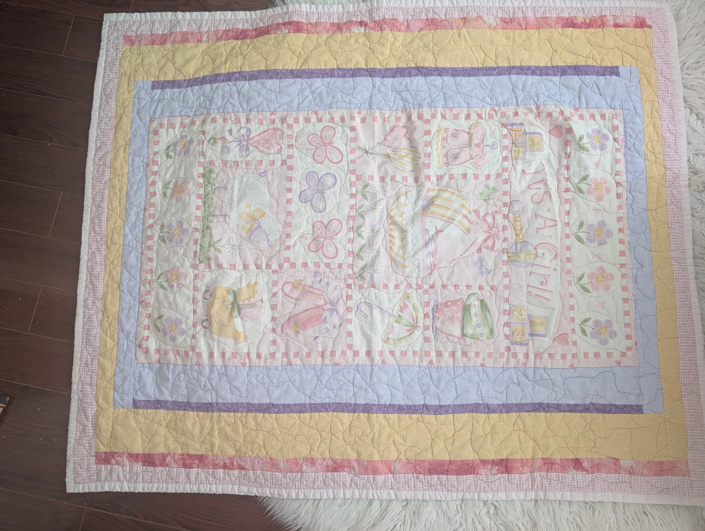 This sweet baby quilt is perfect for a nursery. It features a charming "It's A Girl!" theme with butterflies and baby clothing motifs. Made with soft fabric for comfort.