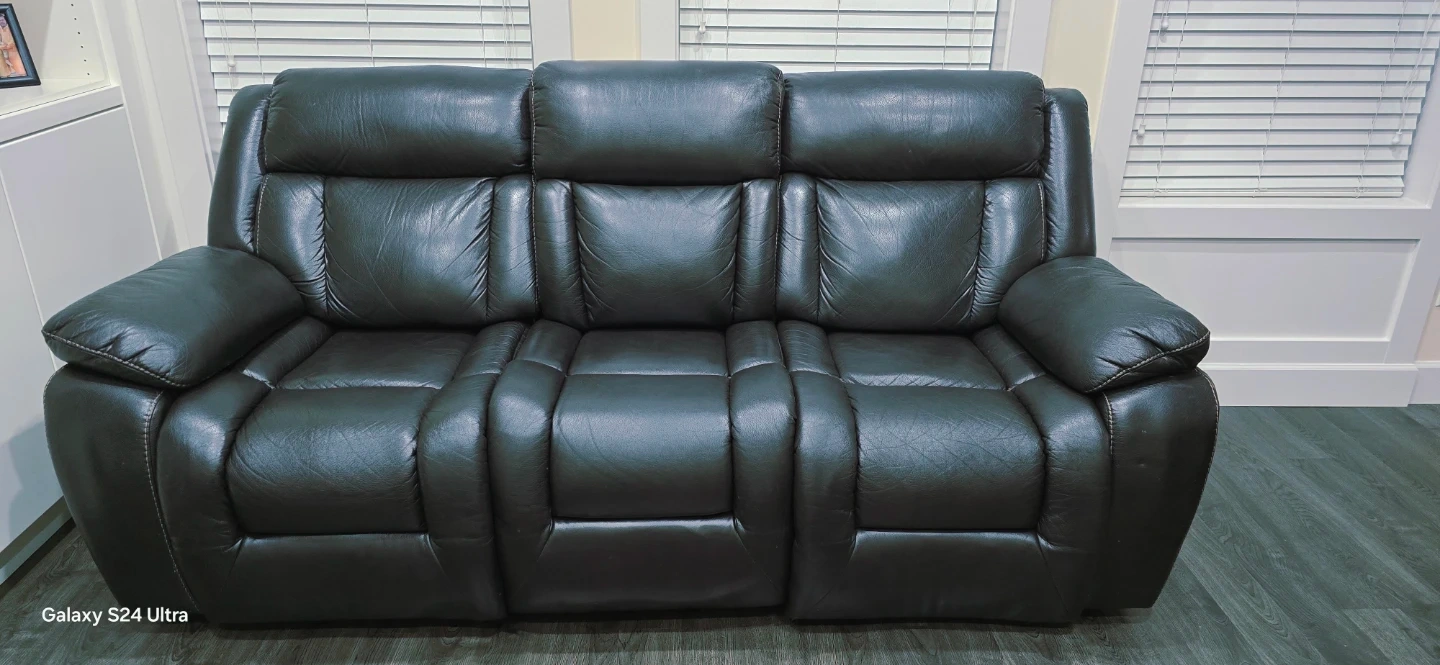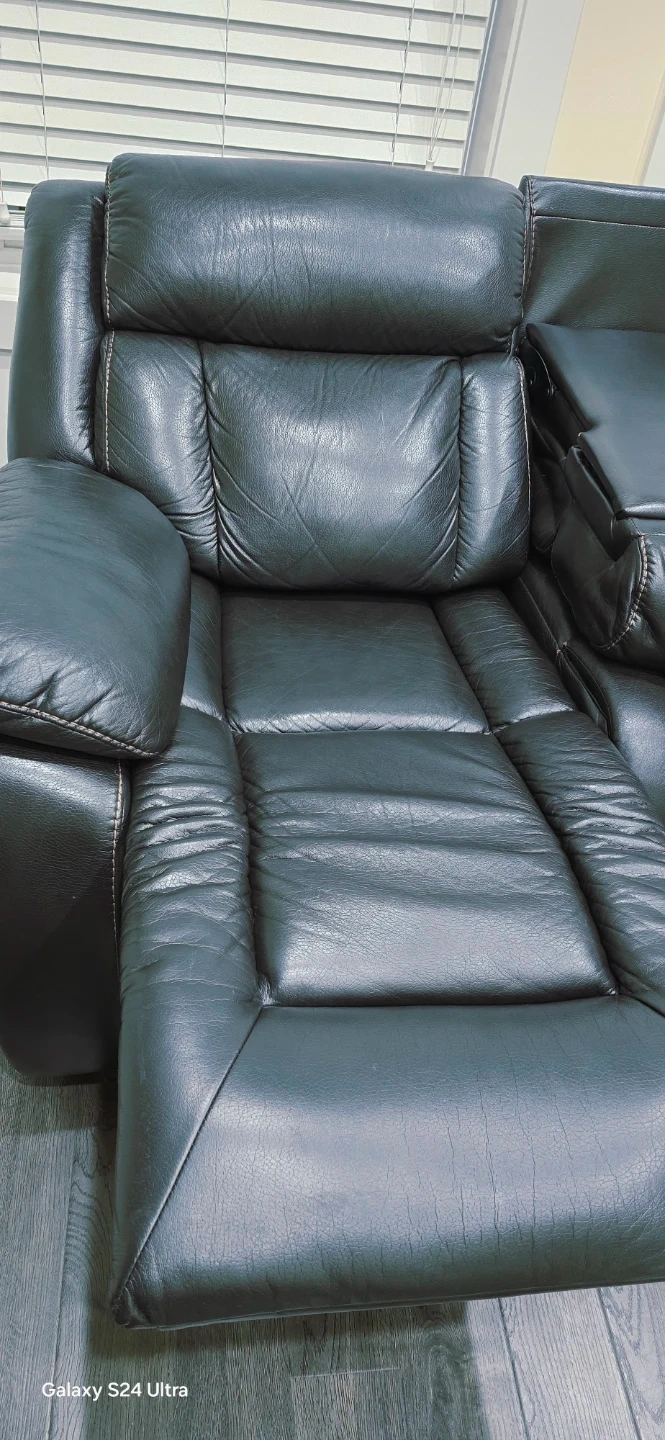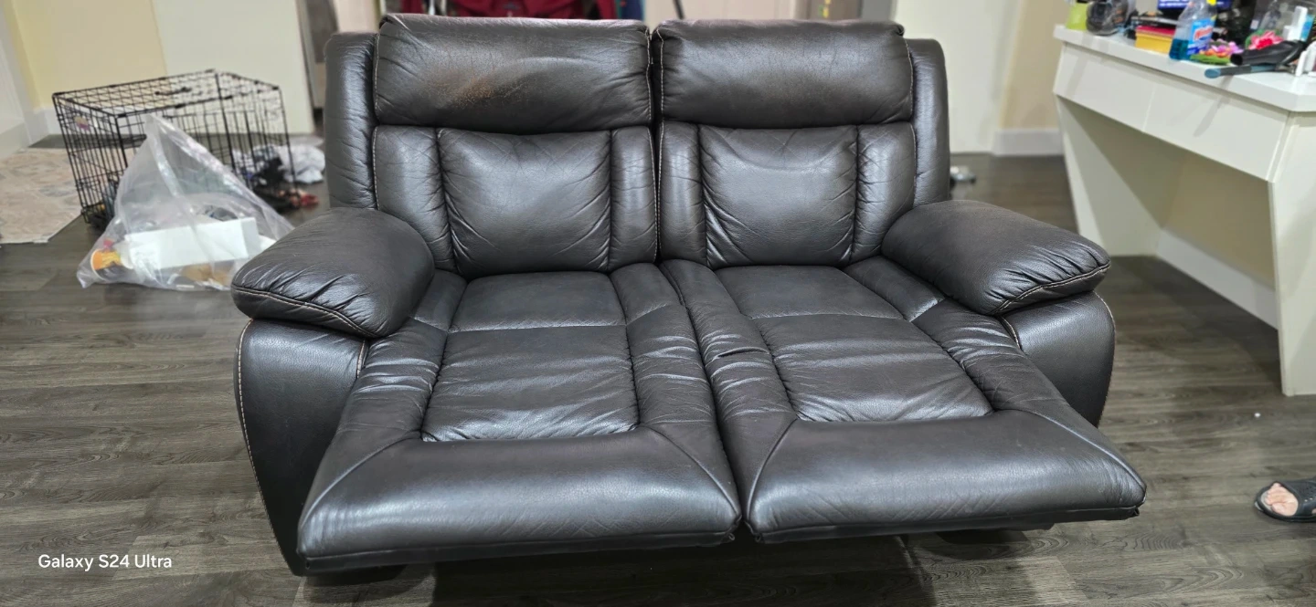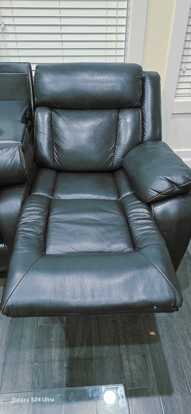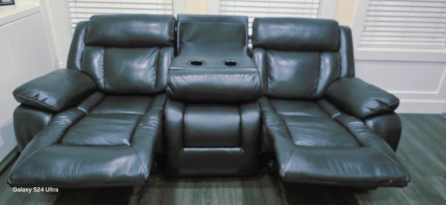 3+2 seater reclining sofa in a black leather material. It features a centre console with two cup holders and reclining seats on both ends. Some minor wear and tear on the leather is visible. Perfect for a home theatre setup!