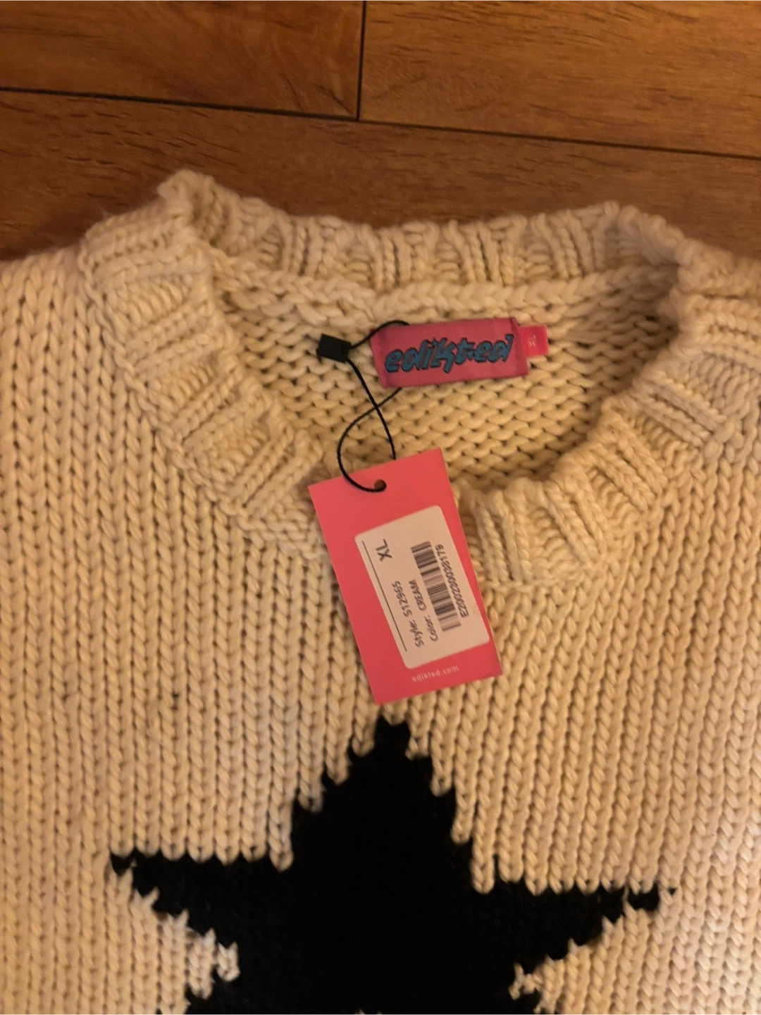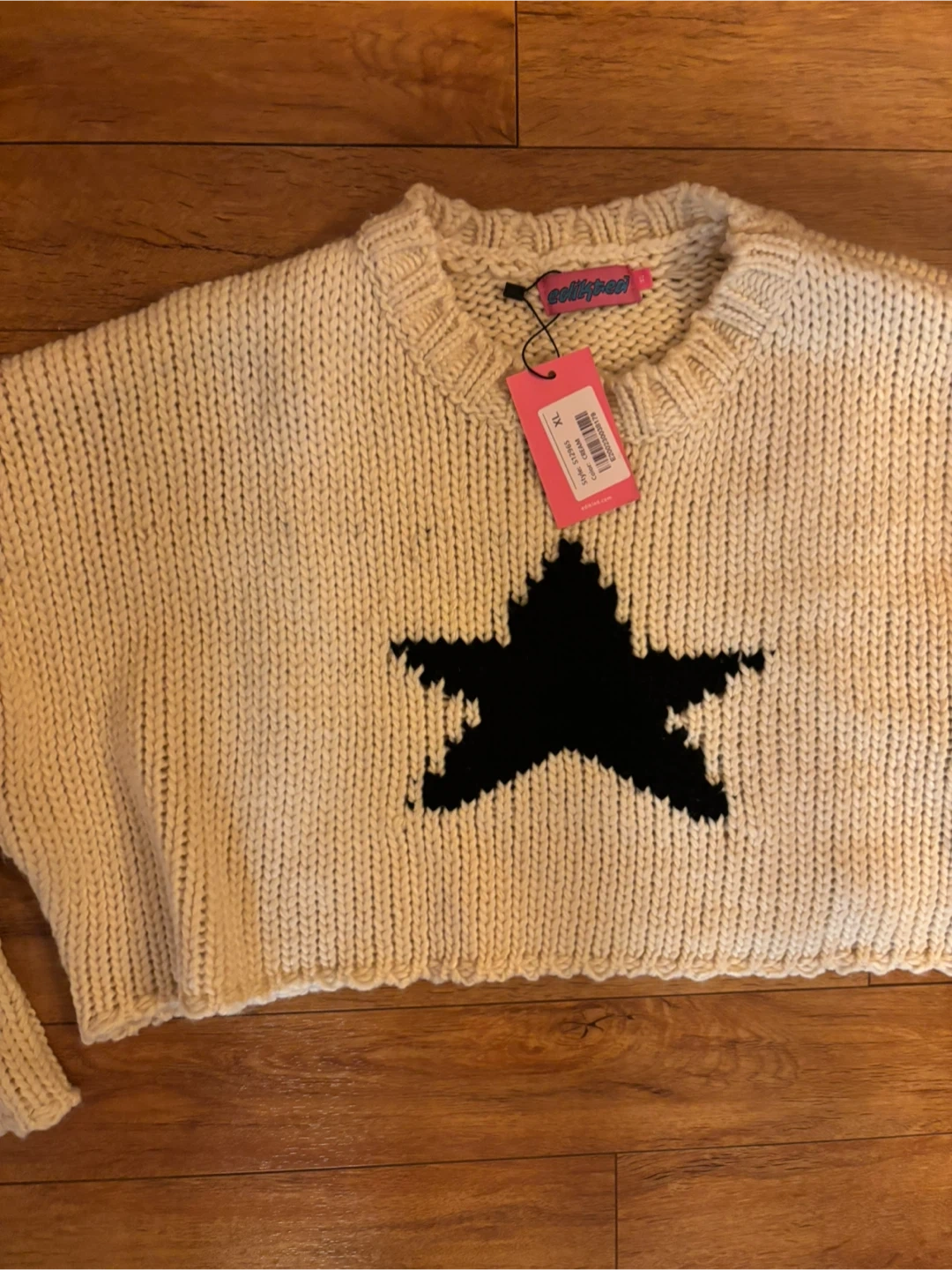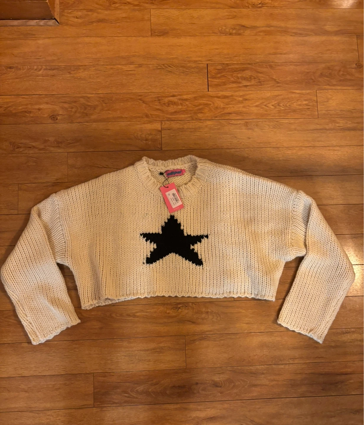 This edikted cropped sweater is cream coloured with a large black star on the front. It's made of a knit material. This sweater is size XL.