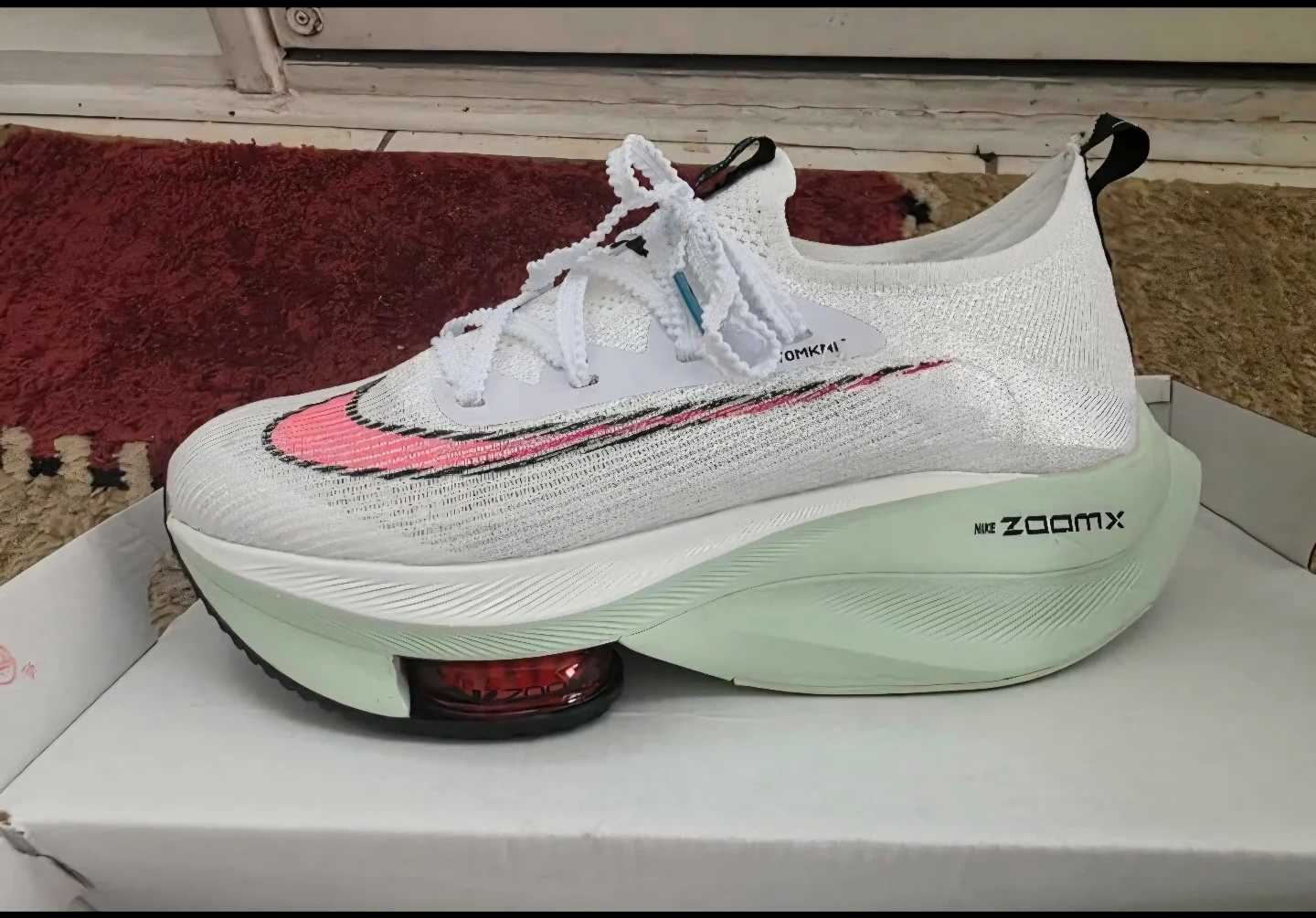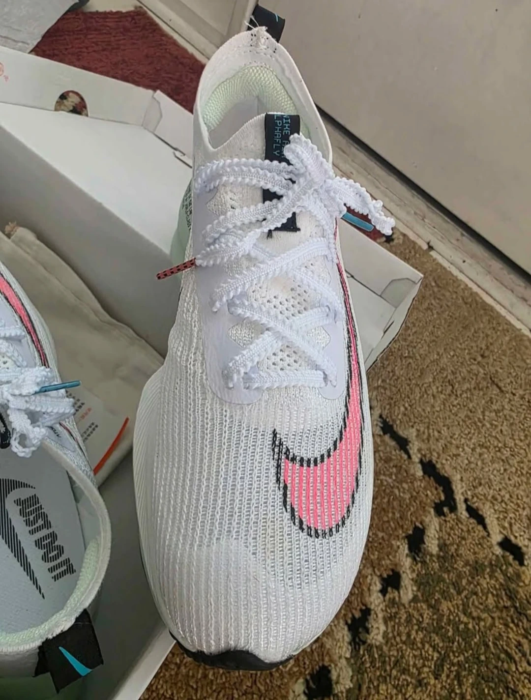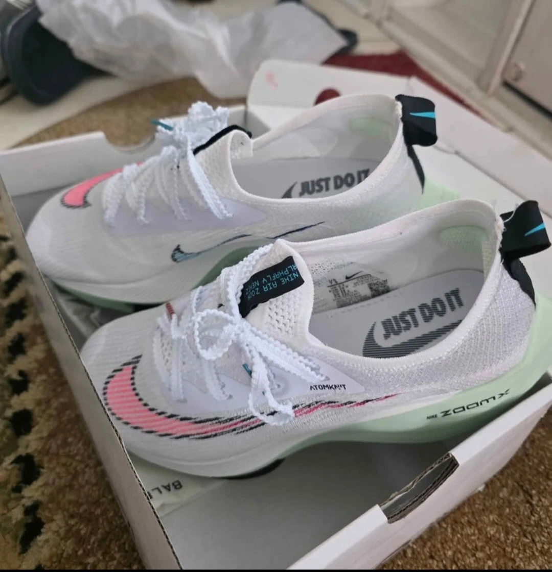Nike Air ZoomX running shoes in white with pink accents. These shoes are designed for performance. They're built with a breathable knit upper and responsive cushioning. Ideal for runners seeking speed and comfort! Never used, as the wrong size was purchaed. 7.5