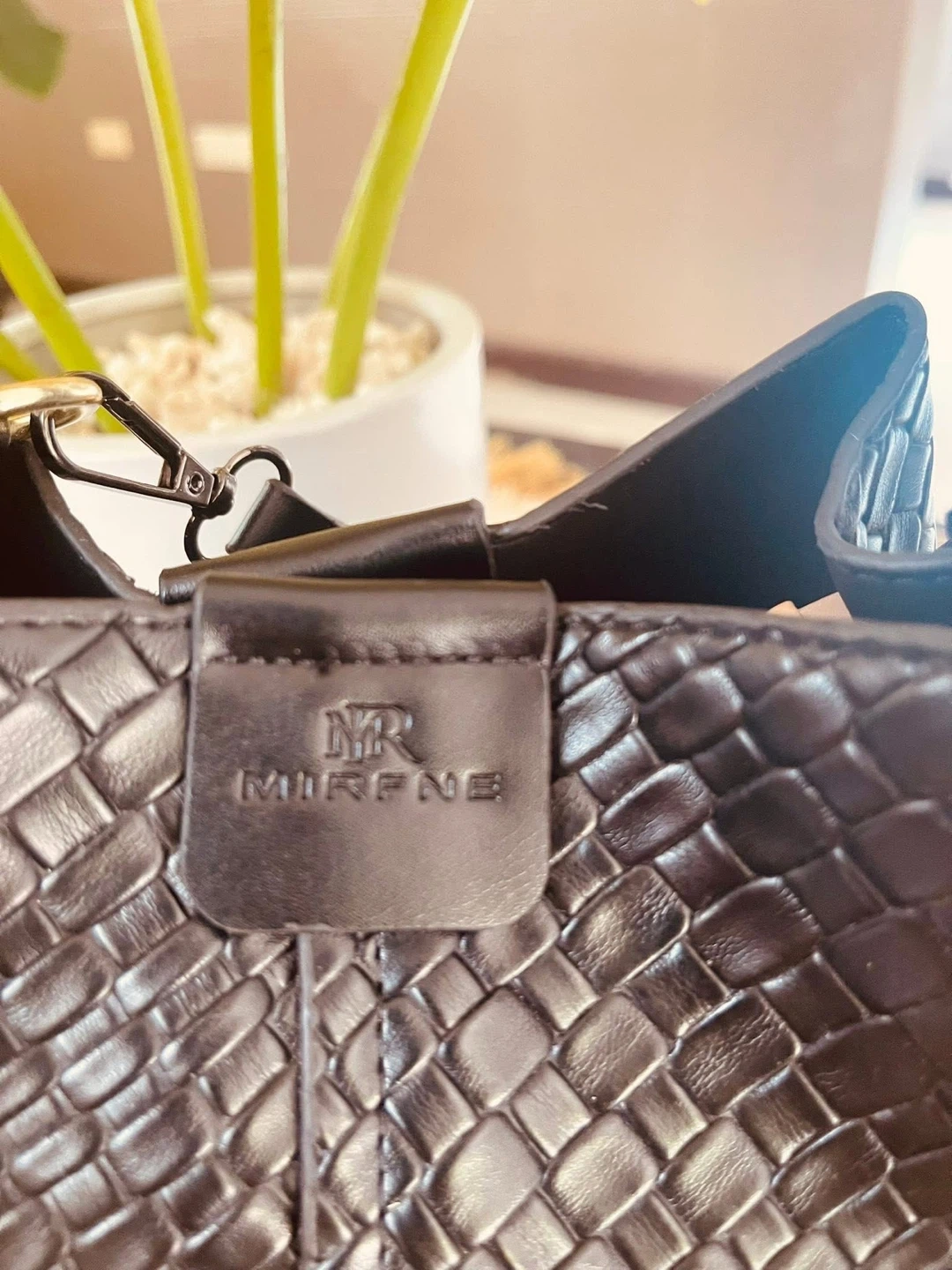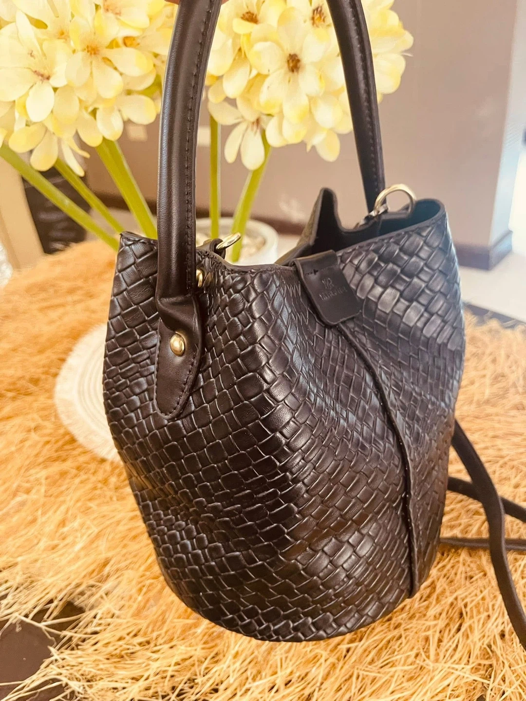 This MIRFENE bucket bag has a woven leather exterior. It comes with a shoulder strap for versatile carrying options. A stylish accessory for day or evening use!