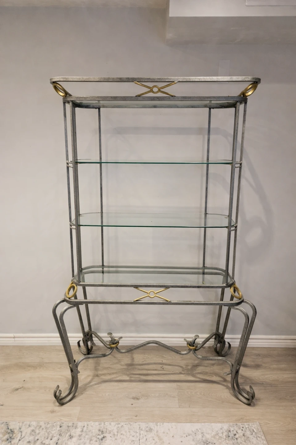 This elegant display shelf features a metal frame with decorative gold accents and glass shelves. It's perfect for showcasing decorative items or storing essentials. The unit has four shelves. Pick up only.