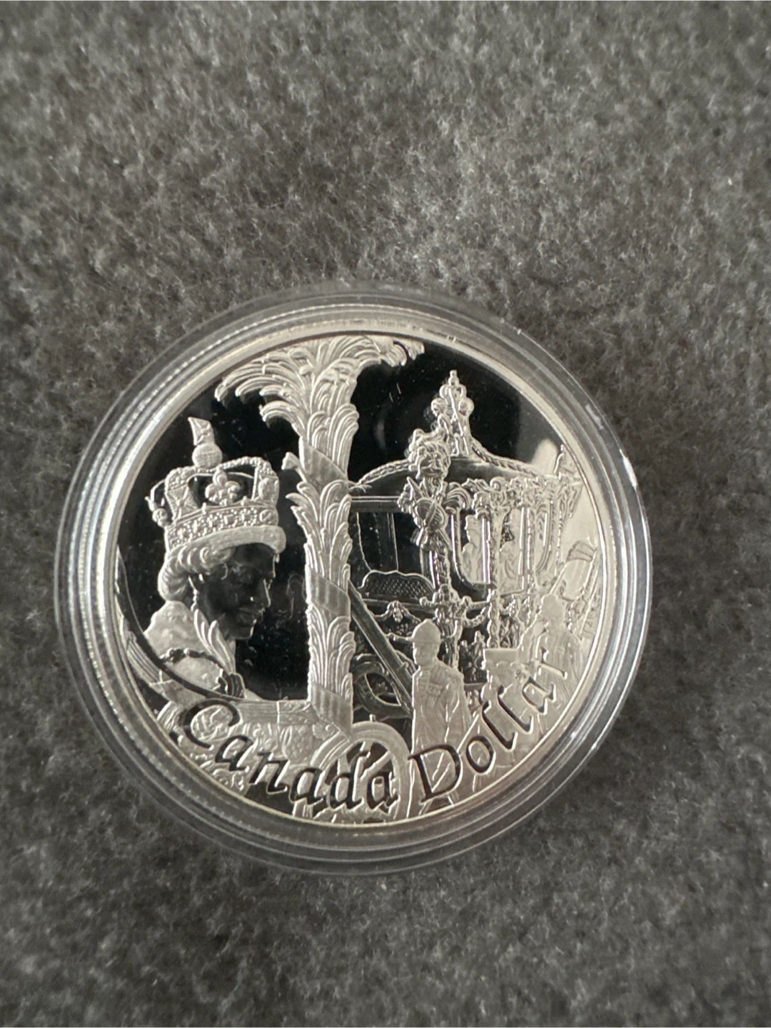 This is a 2002 Canada Proof Silver Dollar coin celebrating the Golden Jubilee. It features Queen Elizabeth II and a carriage on the reverse. It's presented in its original green velvet case with a certificate of authenticity. Made of silver.