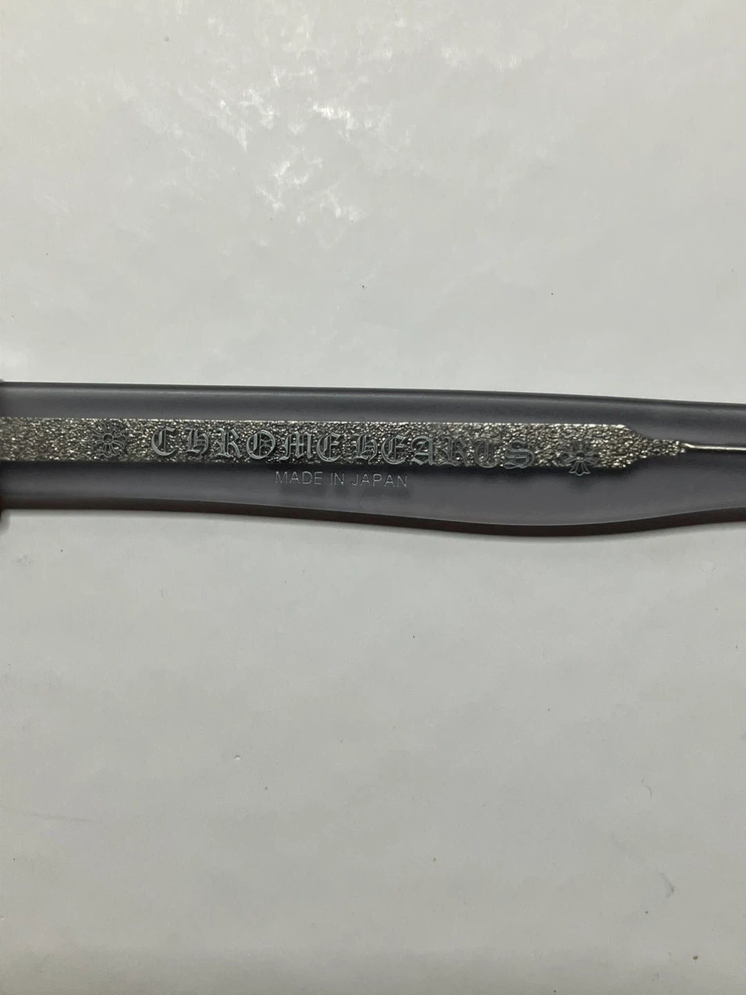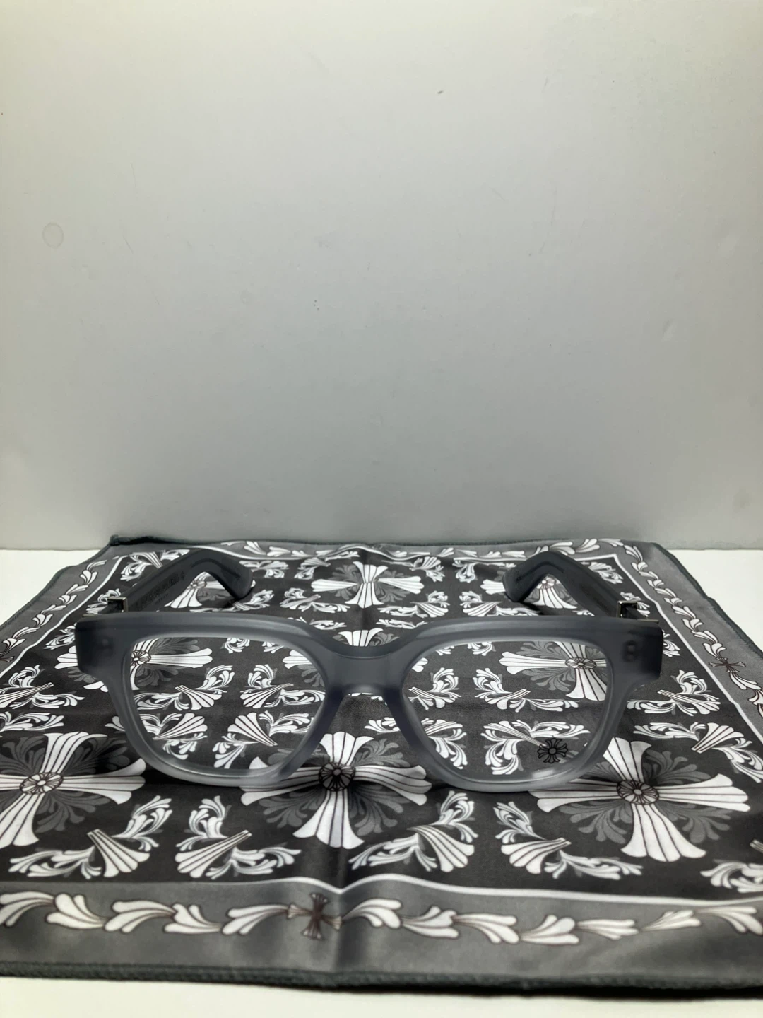Chrome Hearts glasses with a matte grey acetate frame. These spectacles are made in Japan and include the original case, cleaning cloth, and guarantee card. It's a stylish accessory for everyday wear.