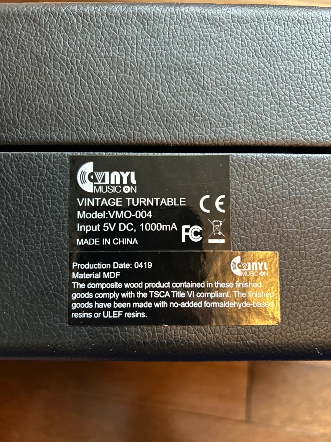 This Vinyl Music On vintage turntable, model VMO-004. Input is 5V DC, 1000mA. Production date is April 2019. The casing is made of composite wood and MDF.