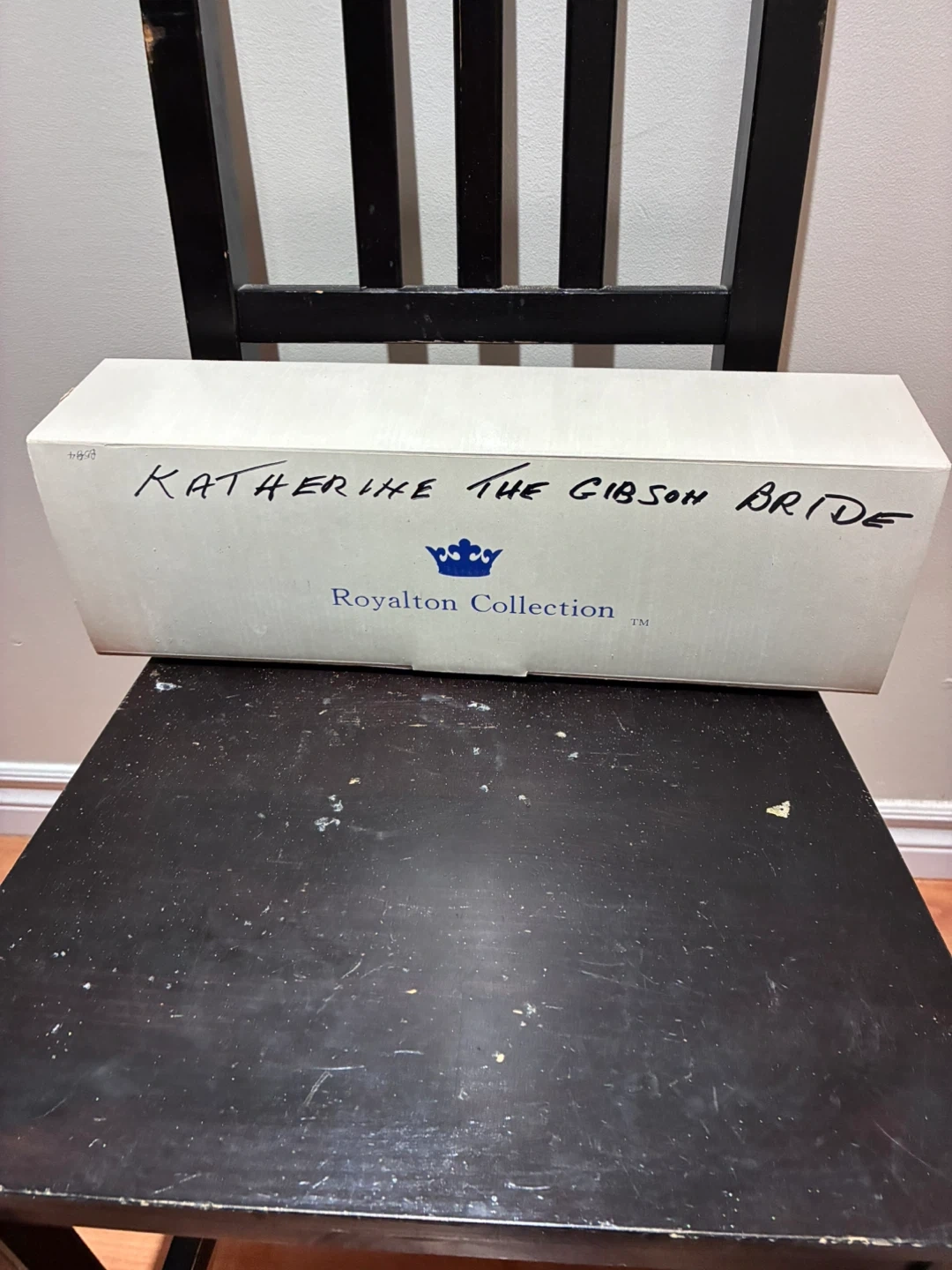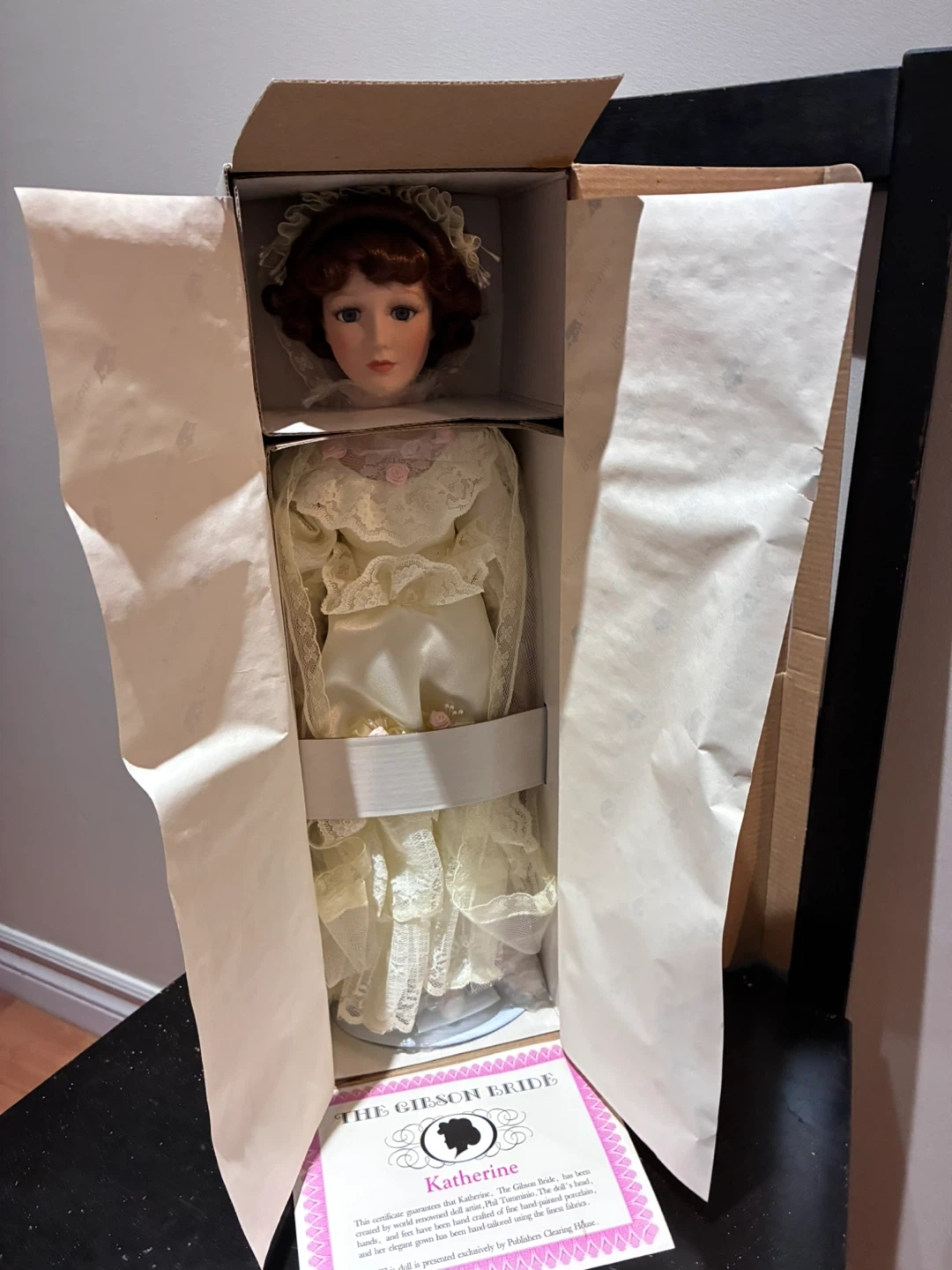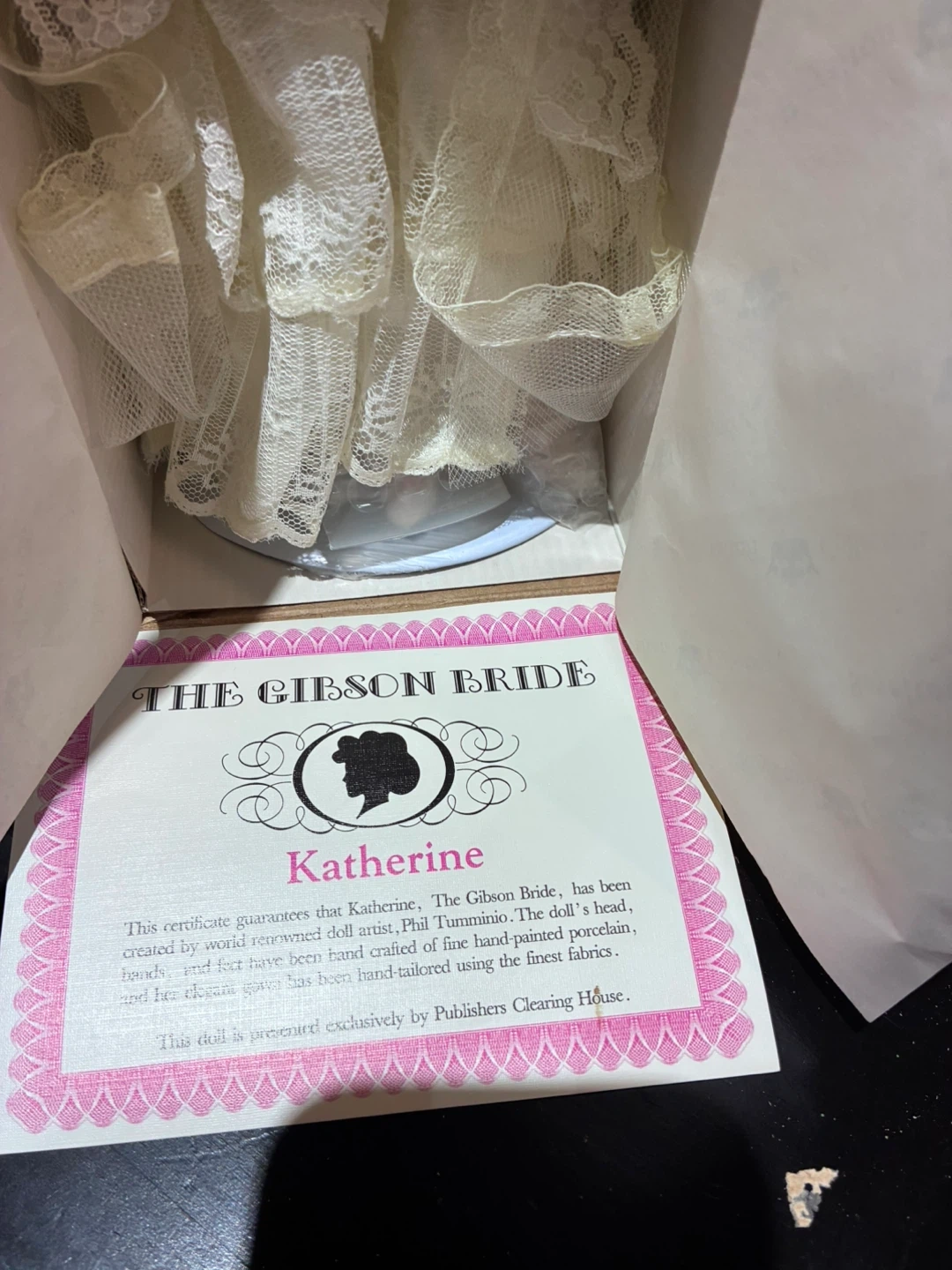 This Katherine doll is from The Gibson Bride collection. It's presented in its original box with protective packaging. The doll features a hand-painted porcelain head, hands, and feet, with clothing tailored using fine fabrics.