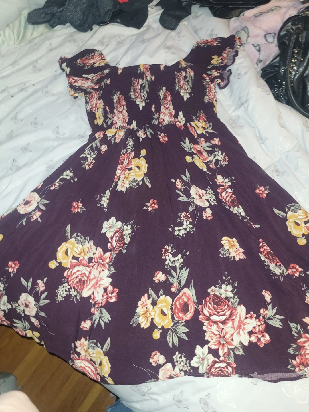 Pretty plum-coloured dress with a vibrant floral print all over. It features an off-the-shoulder neckline and short ruffled sleeves. This dress is made from a lightweight fabric, perfect for warmer weather.