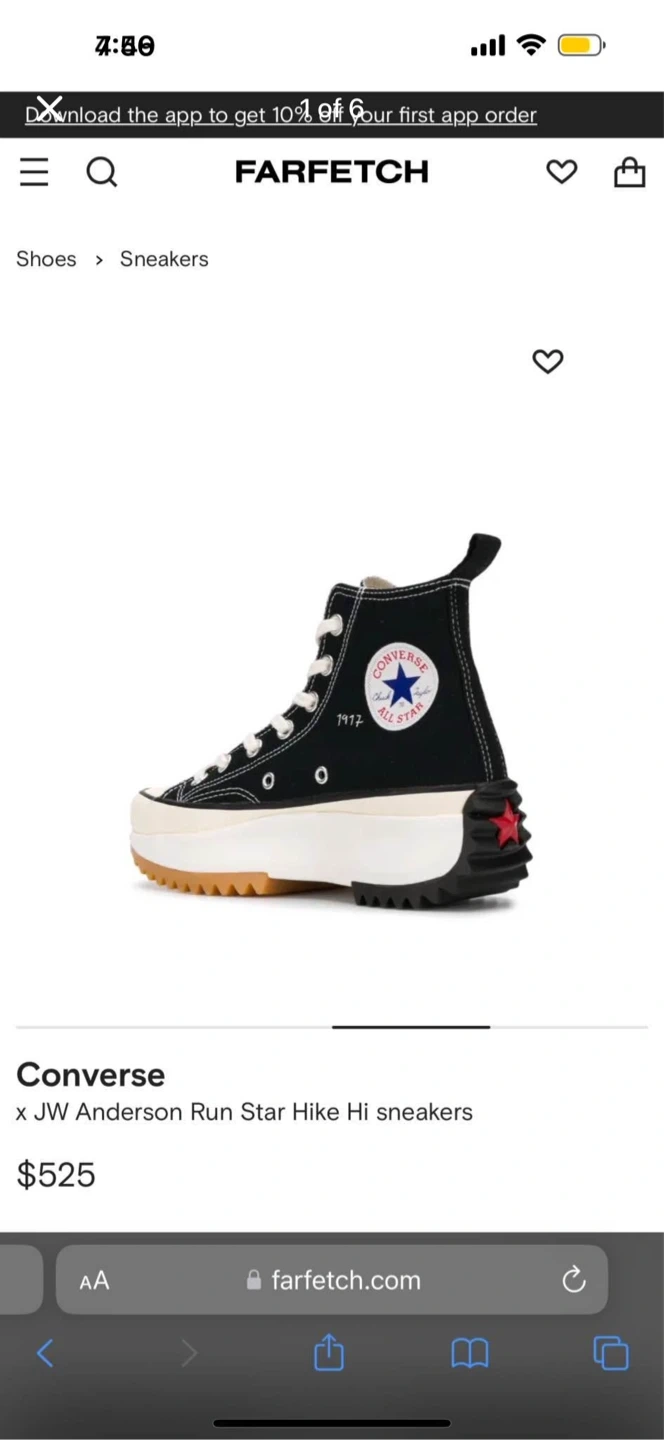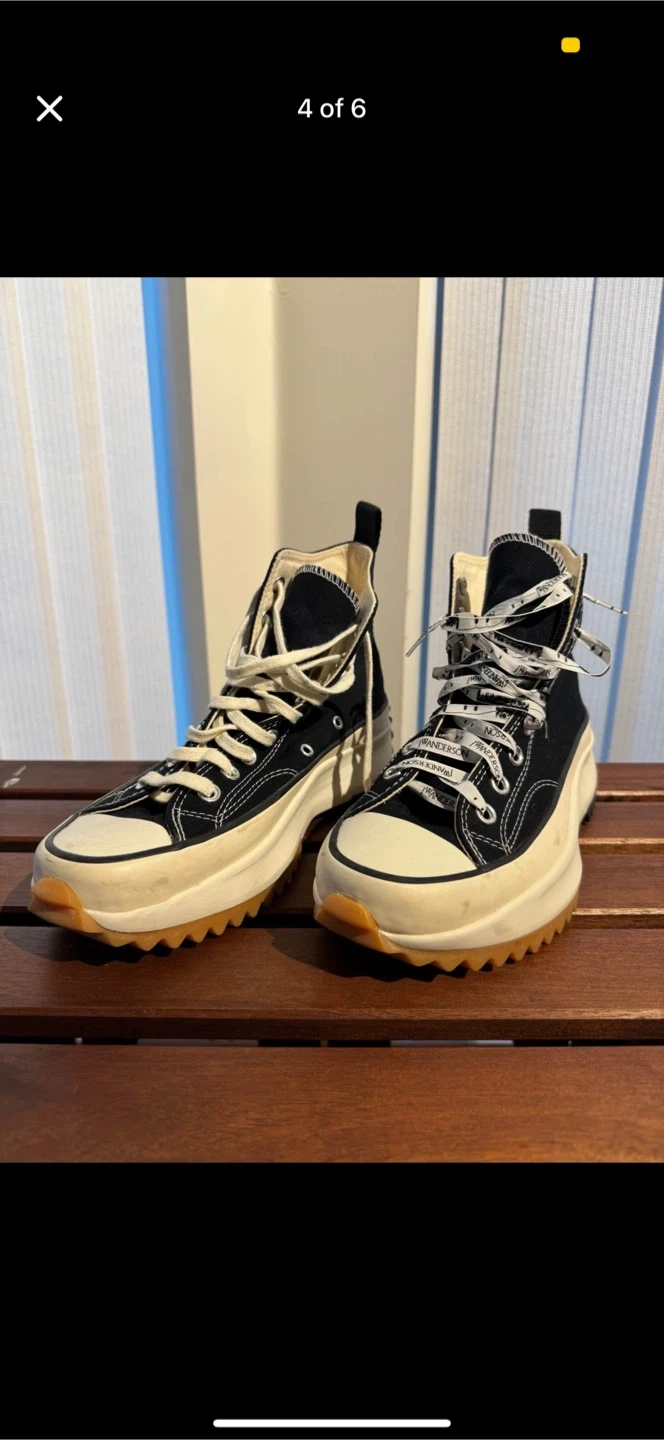 These Converse x JW Anderson Run Star Hike Hi sneakers are black canvas with a chunky platform sole. They feature white laces and the iconic Converse star logo. Great for adding a bold statement to any outfit!