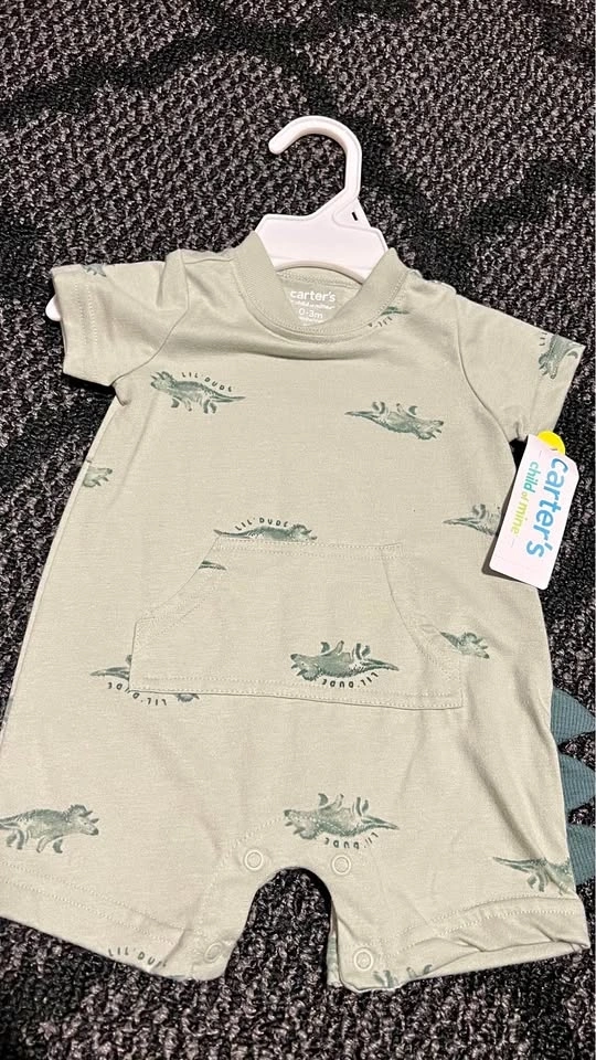 Cute Carter's Child of Mine baby romper. Size 0-3m. Light green color with cool dinosaur prints, says 'Lil Dude' on them. Has short sleeves, snaps at the bottom for easy changes, and a little front pocket. Still has tags on.