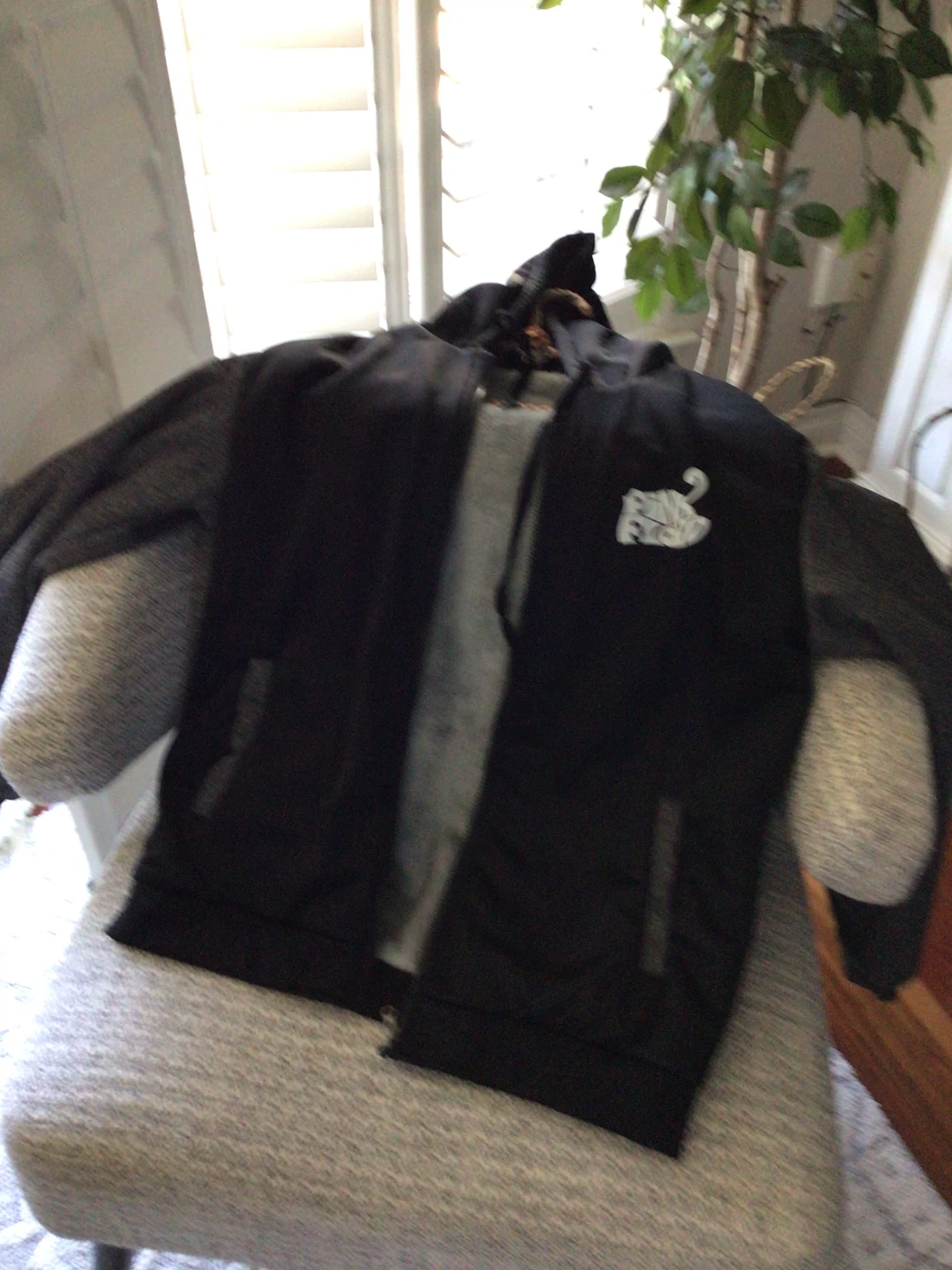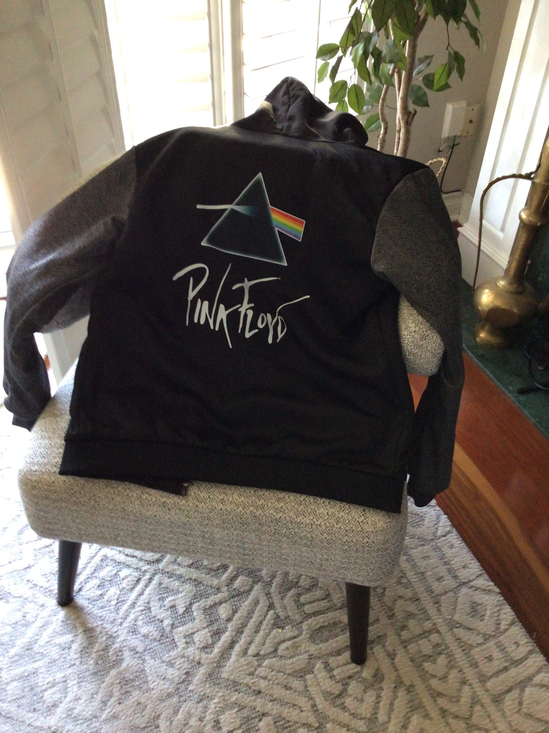 Black track jacket with Pink Floyd Dark Side of the Moon graphic on the back. Features contrasting grey sleeves and a full zip closure. Comes with pockets on the front. A cool piece for any fan!