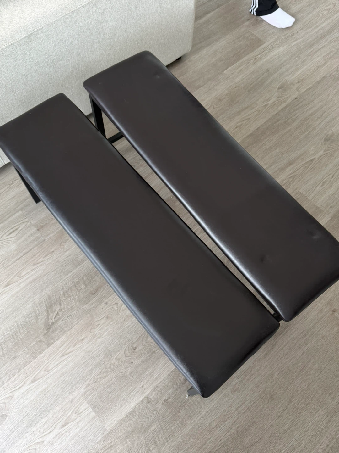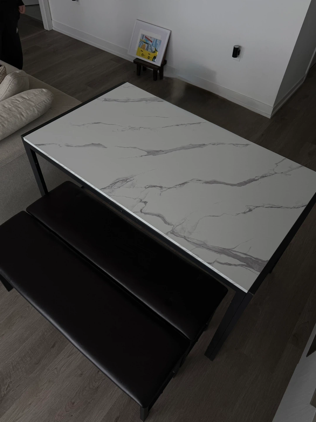 Includes a marble-look tabletop dining table with black metal legs and two dark brown upholstered benches. Perfect for smaller dining areas or kitchens.