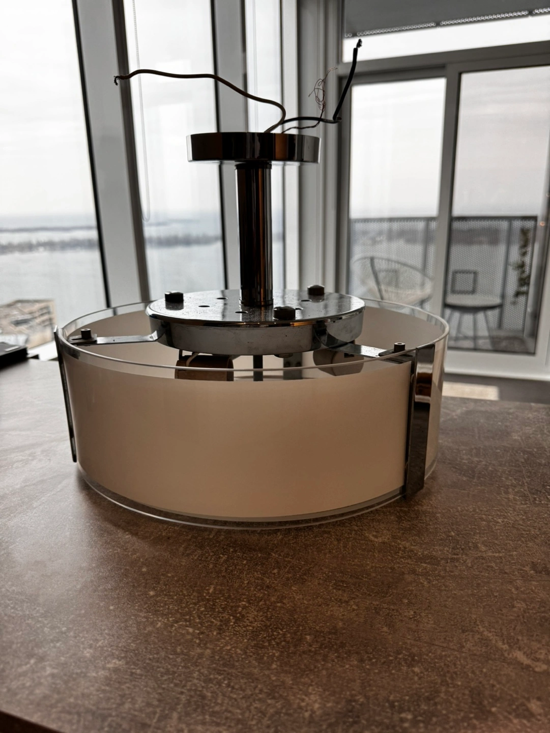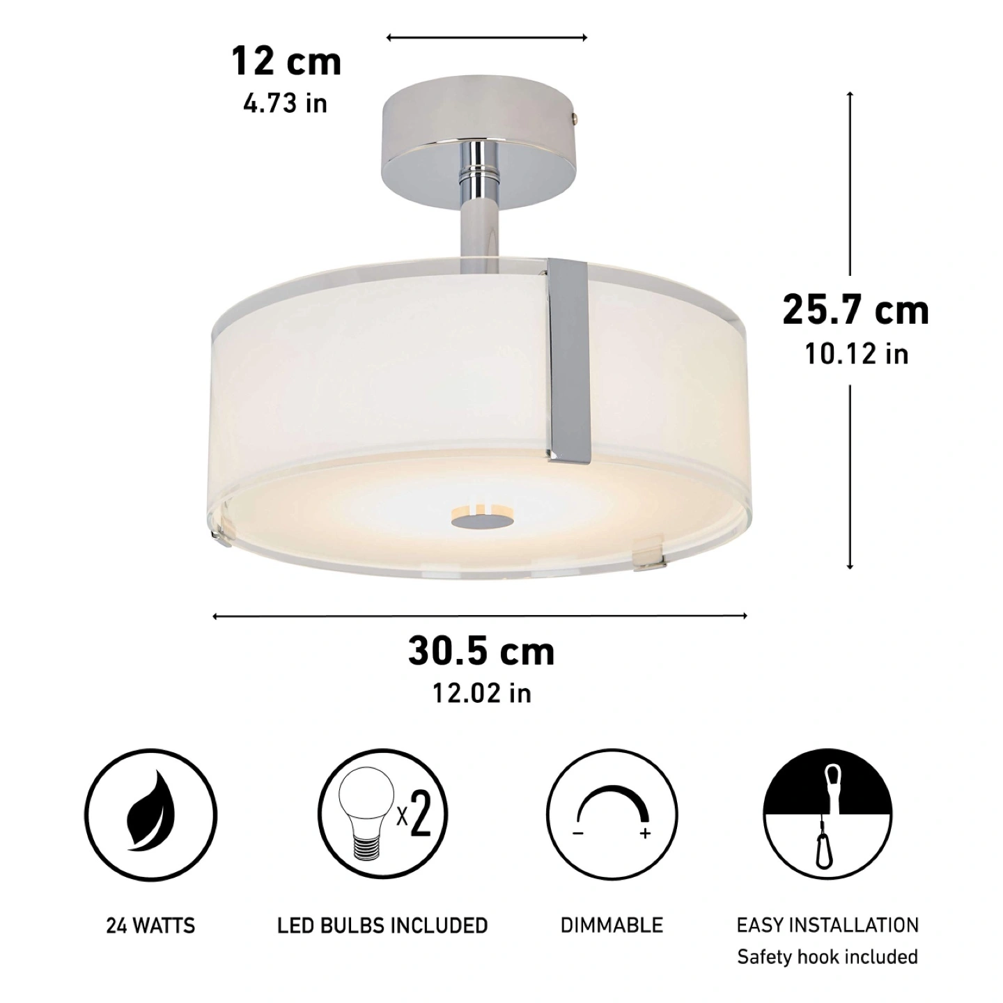 Chrome finish, silk screen glass shade. Energy star LED bulbs included. Dimmable. Easy installation, hardware included.40 w