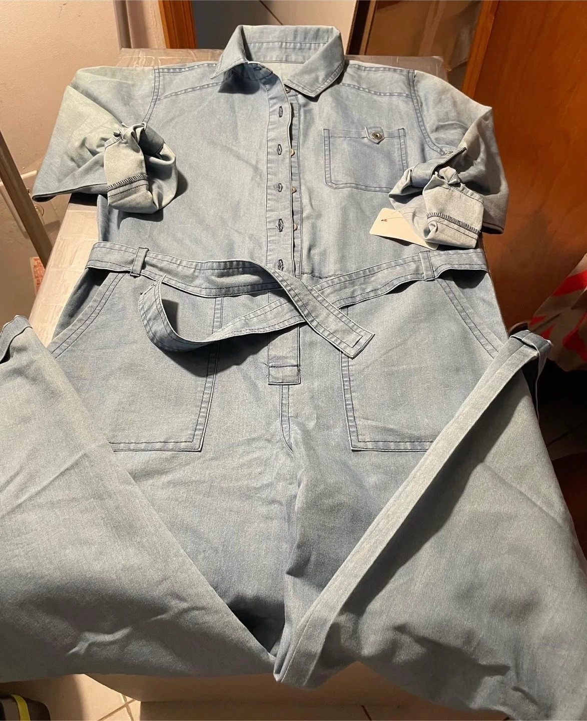 This is a light wash denim jumpsuit. It features a collared neckline and a tie waist. The sleeves can be rolled up. Made of denim material.