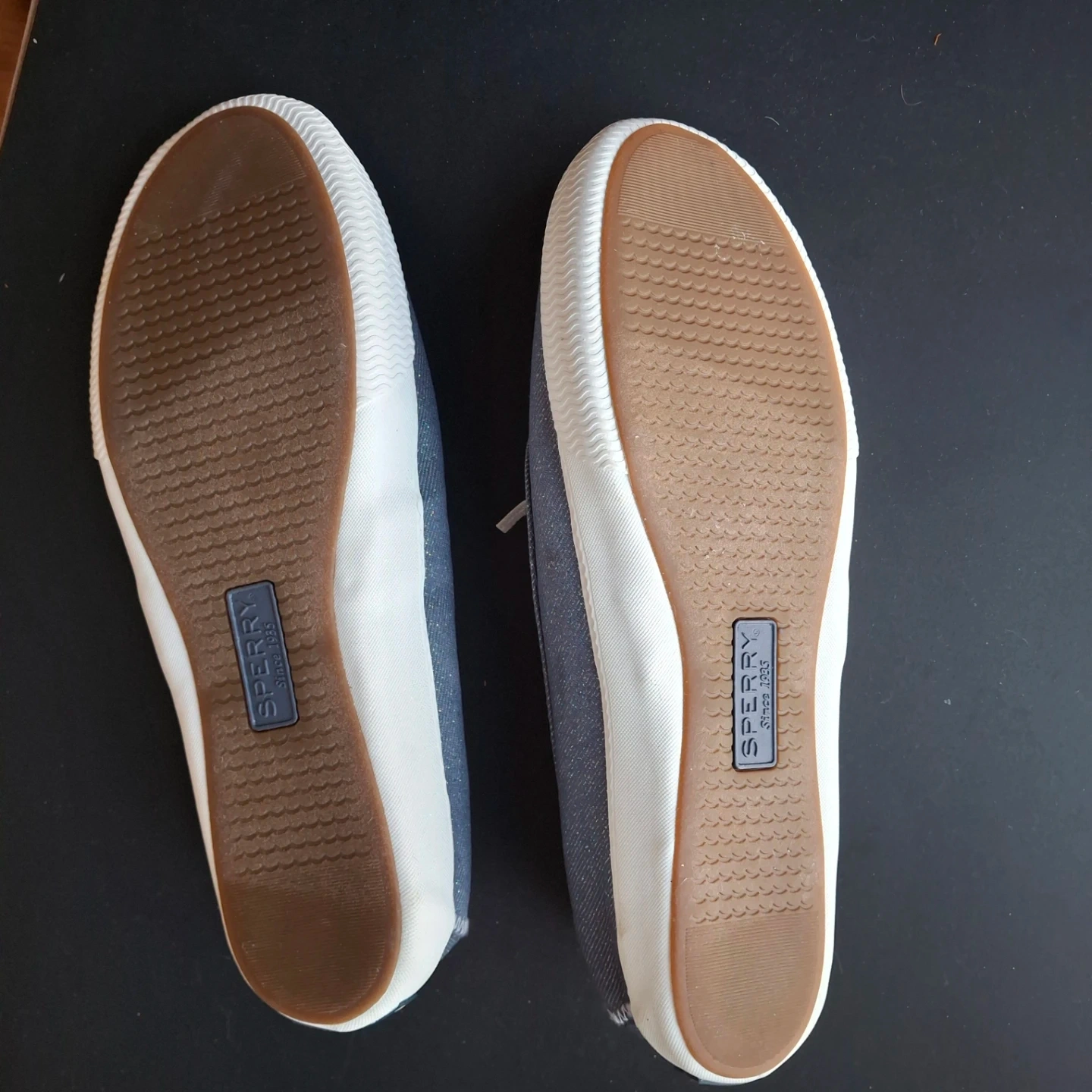 Sparkly blue denim boat shoes from Sperry Top-Sider. Comfortable slip-on style with rubber sole. Includes new in original box.
