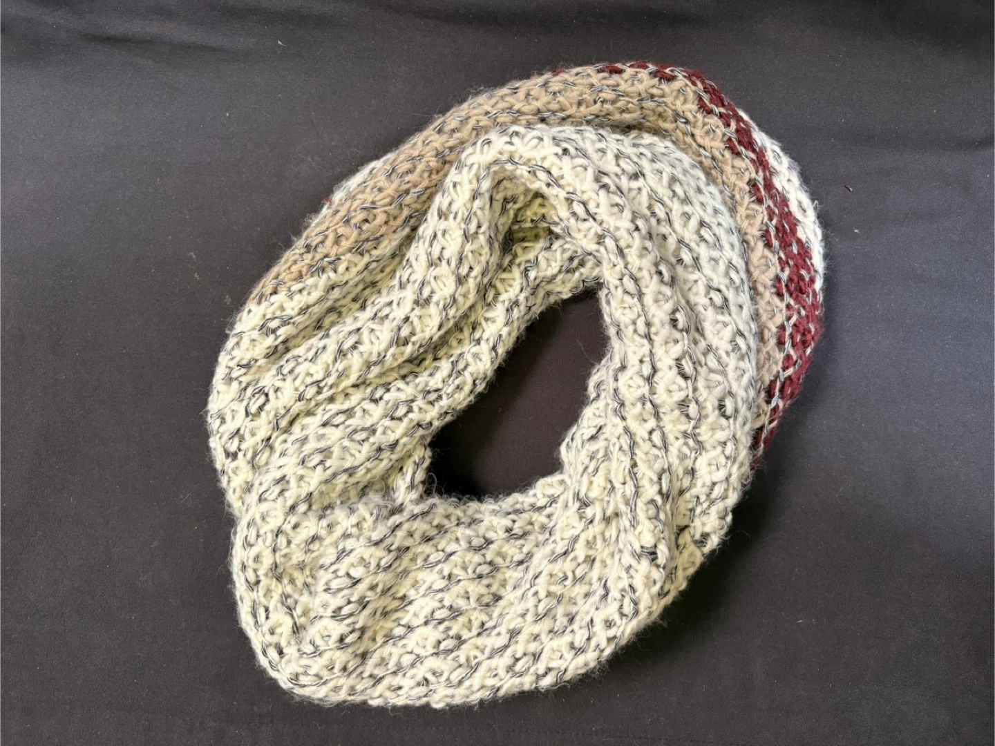 A warm, chunky knit infinity scarf from Roots. It features a mottled cream and grey yarn with maroon and black accents. One size fits all, perfect for cooler weather!