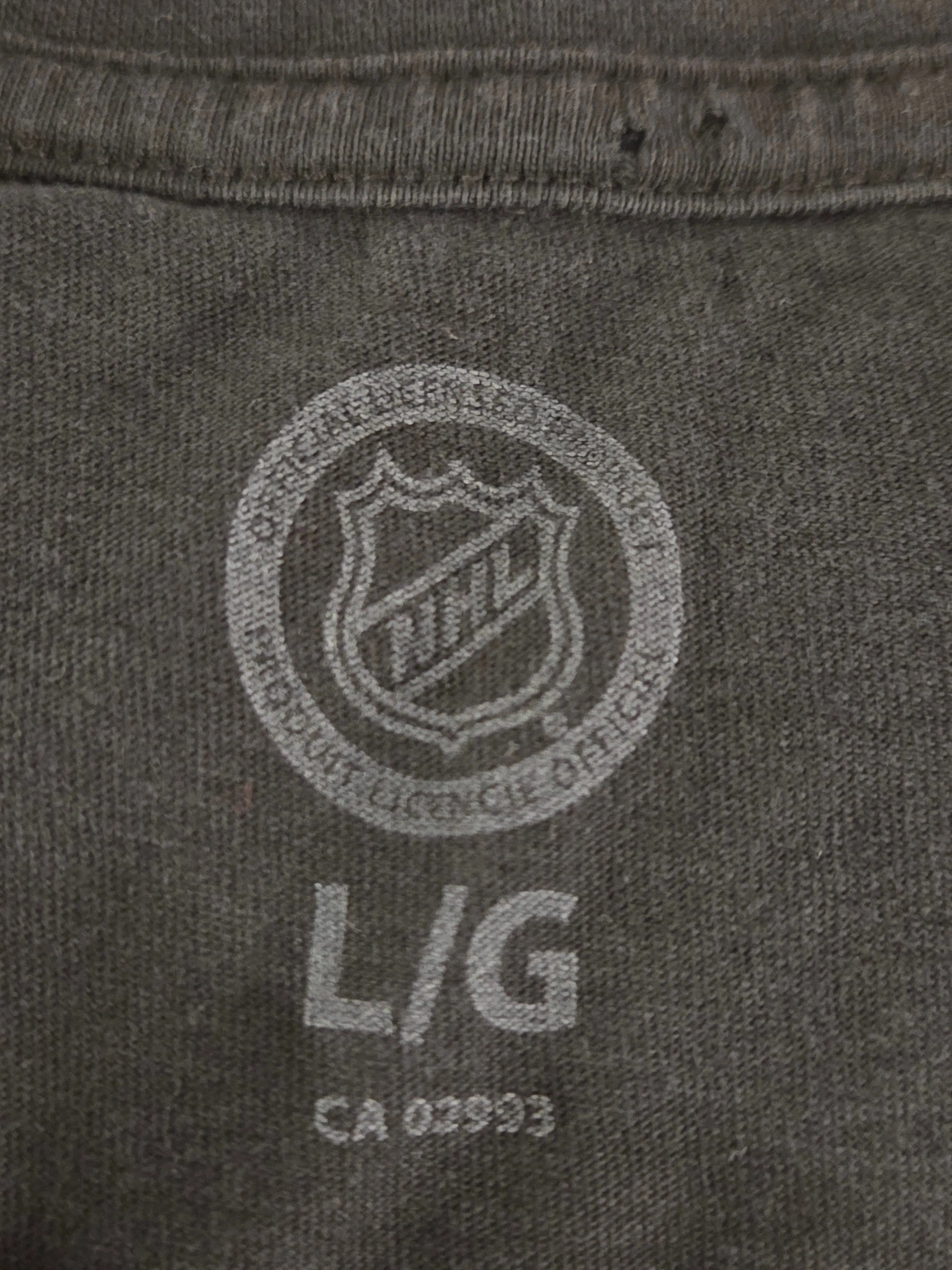 Official Toronto Maple Leafs NHL short-sleeve tee in black, tagged size L/G. Classic leaf crest in grey with blue outline. Soft cotton-jersey feel with tagless neck print (NHL Official Licensed Product). Pre-owned and gently worn with natural wash fade; graphic still looks good with minor cracking from normal wear – no major flaws noticed.