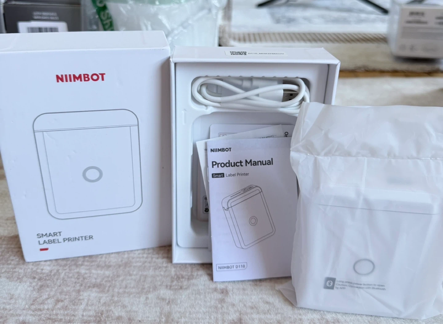 NIIMBOT D110 smart label printer. It's a portable device for creating custom labels. Includes the printer, a charging cable, and the product manual.