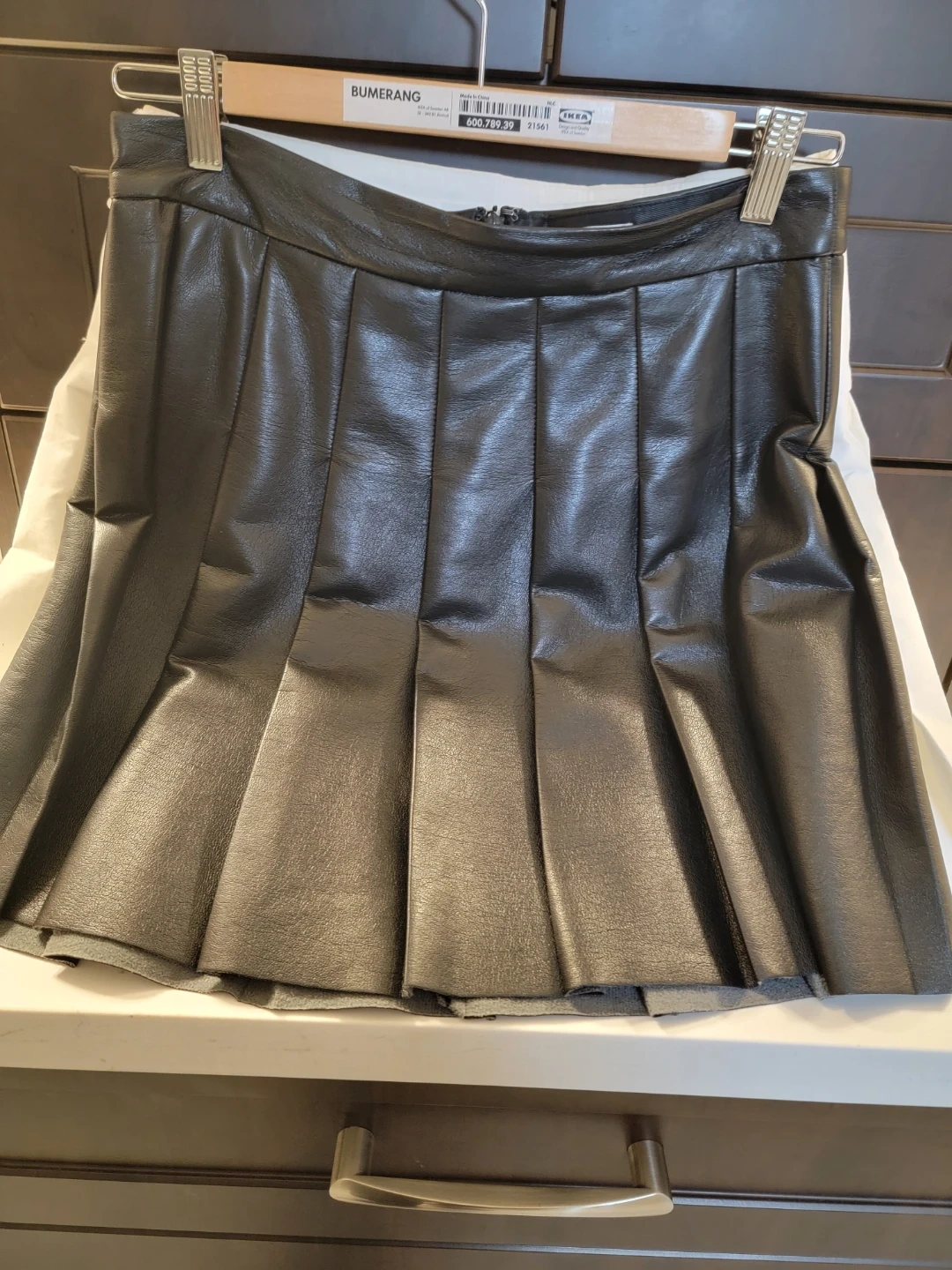 Black faux leather pleated mini skirt. It has a zippered back closure. This skirt is a stylish addition to any wardrobe!
