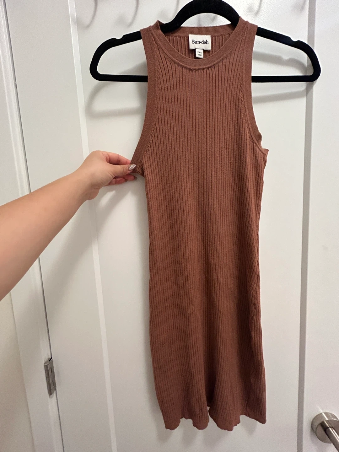 Sun-deh ribbed knit dress in a warm brown hue. Sleeveless design with a racerback cut. Made from a stretchy knit material. *it shows 2xs, but it fits me, I normally wears S/M*