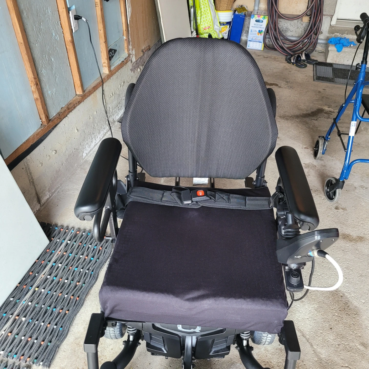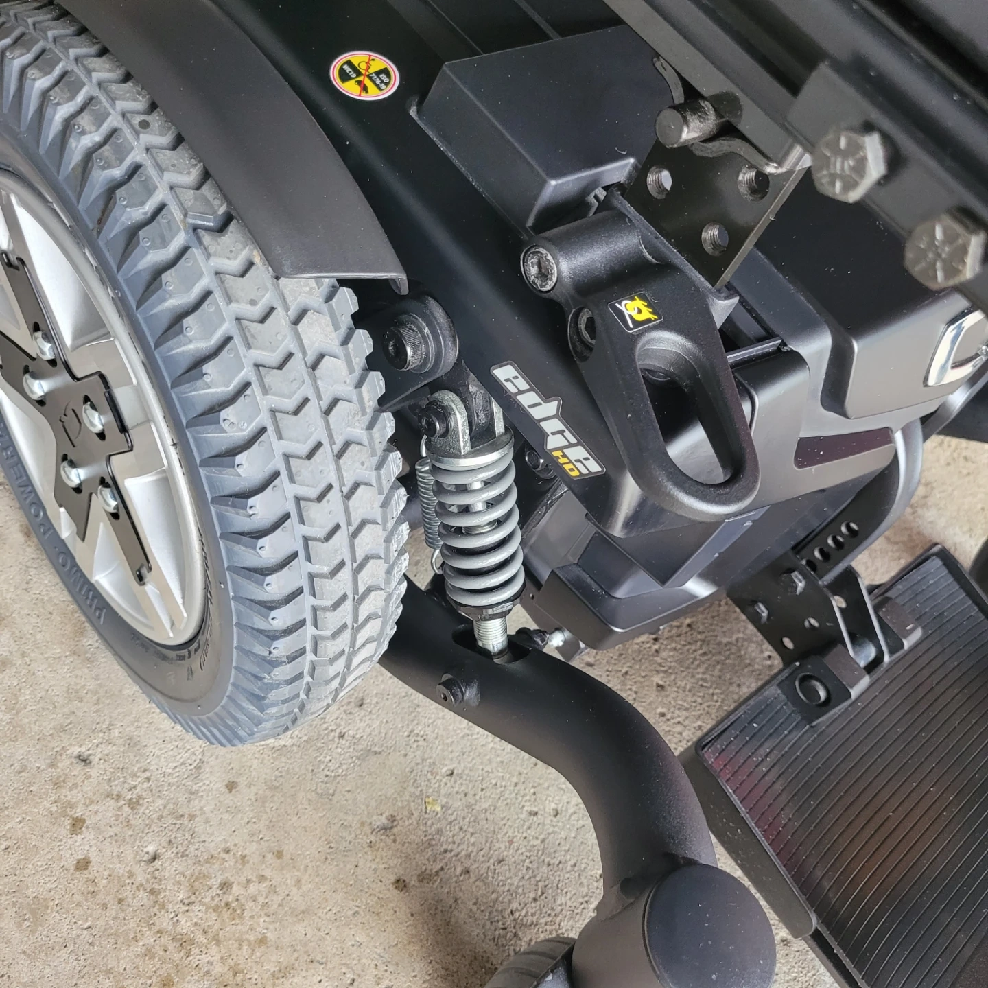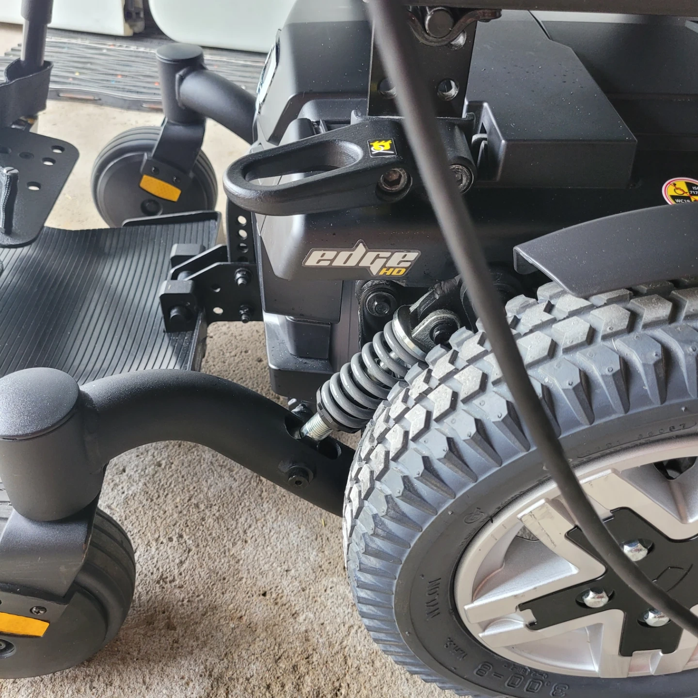 This is a Pride Mobility Edge 3 HD power wheelchair. It features Geo-Matrix Hybrid seating. This chair is designed for robust performance and comfort.