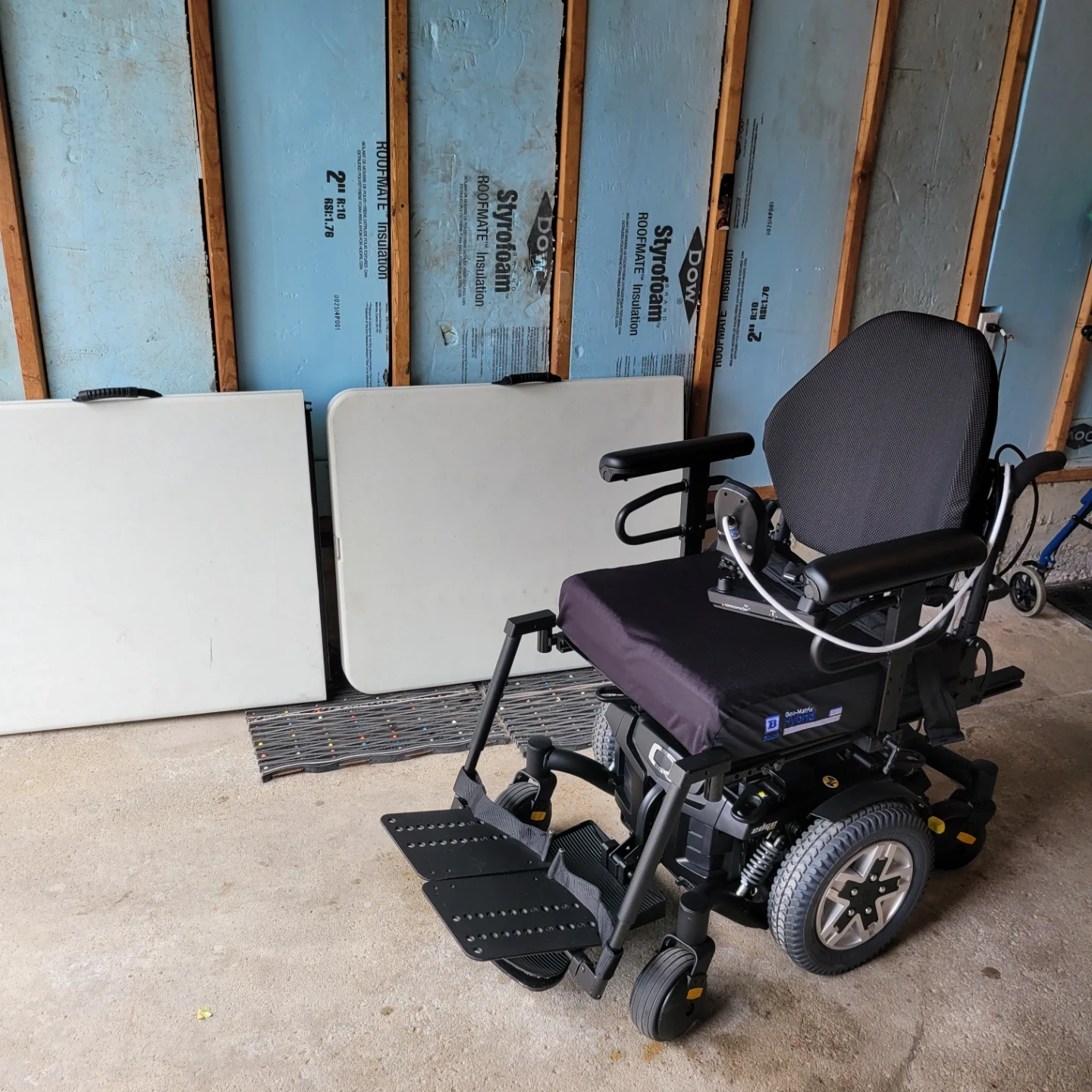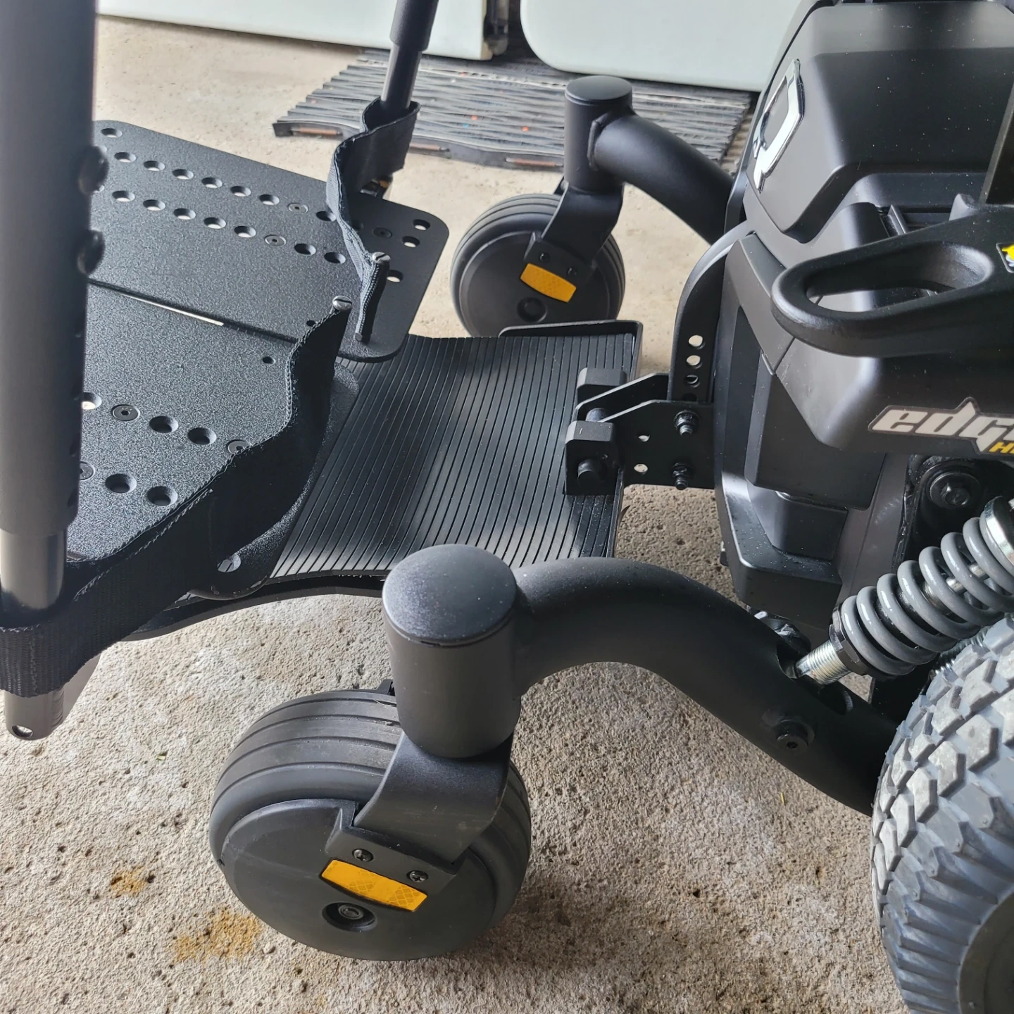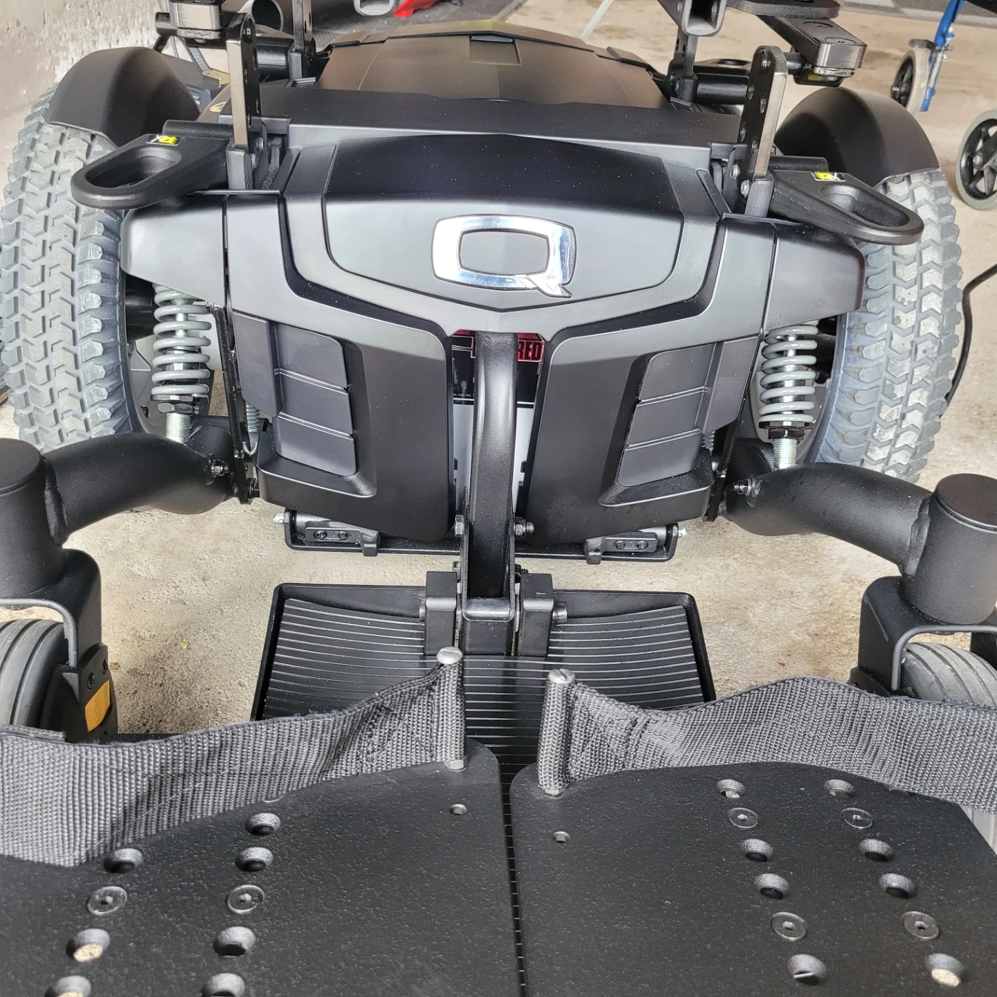 This is a Pride Mobility Edge 3 HD power wheelchair. It features Geo-Matrix Hybrid seating. This chair is designed for robust performance and comfort.
