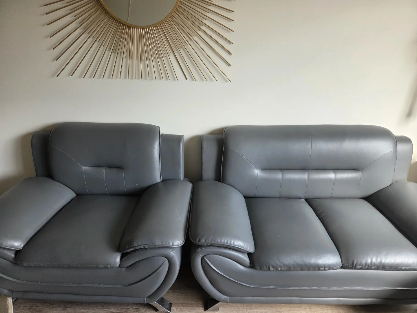 Two grey faux leather seating pieces for your living room. Includes a loveseat and a matching armchair. Modern curved design with padded armrests.