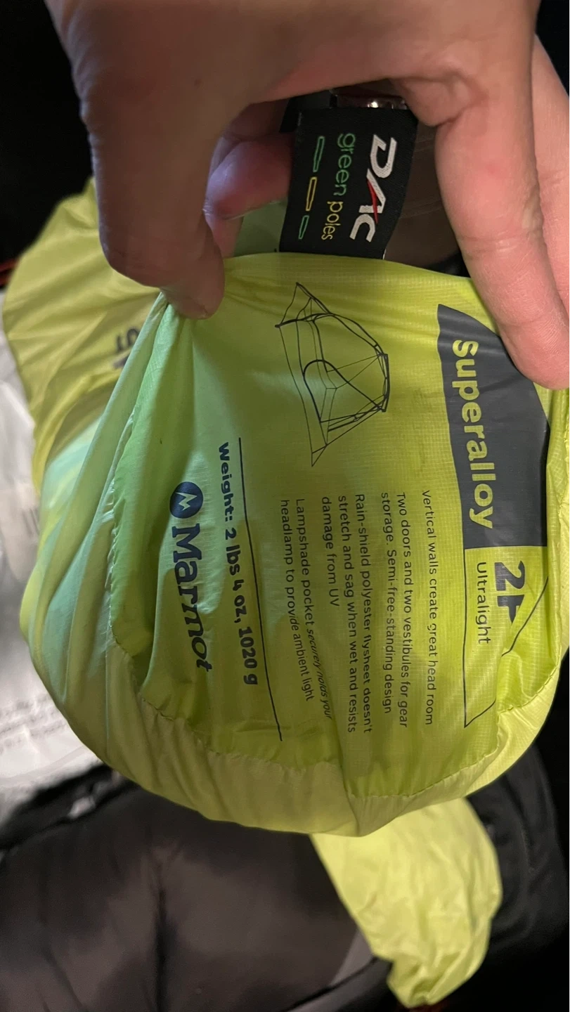 Marmot Superalloy 2P ultralight tent. Weight is 2 lbs 4 oz (1020 g). It has vertical walls to create great head room. Two doors and two vestibules for gear storage.