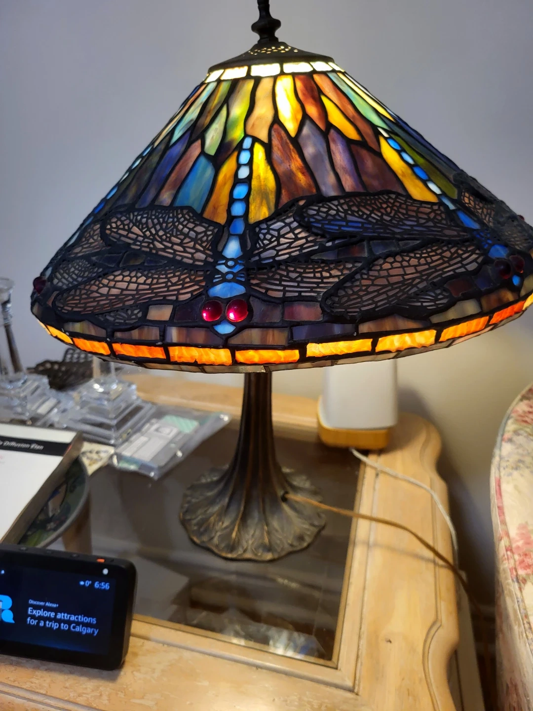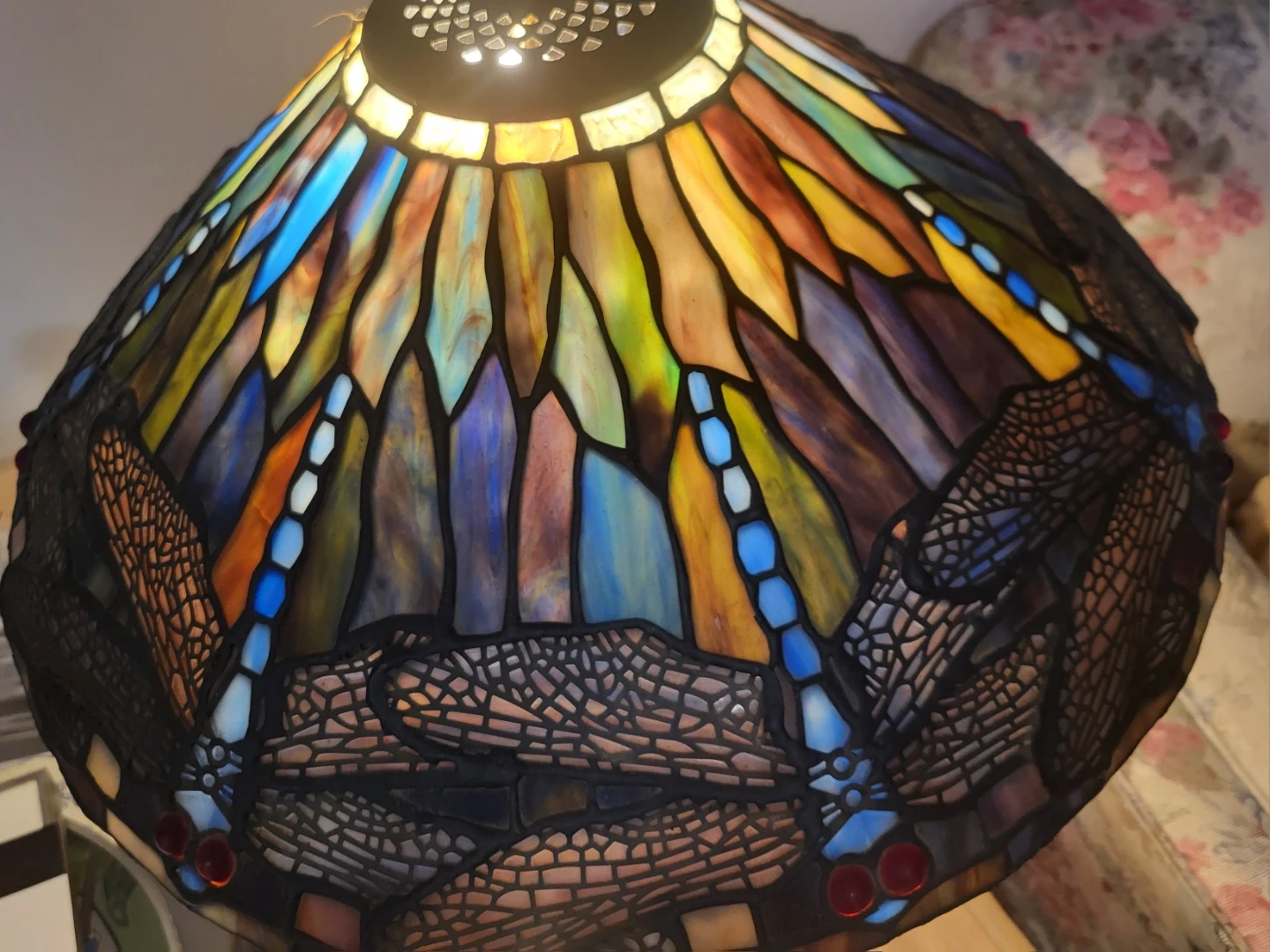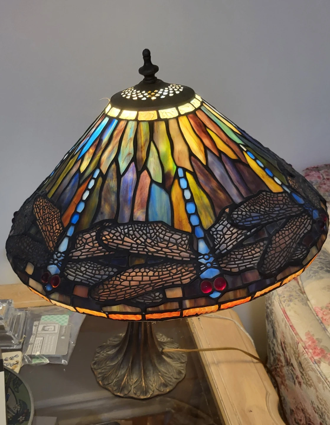 This striking Tiffany-style lamp features a stained glass shade with a detailed dragonfly motif. The colourful glass pieces create a beautiful glow when illuminated. It's mounted on an ornate bronze-tone base. This lamp's intricate design makes it a lovely accent piece for any room.