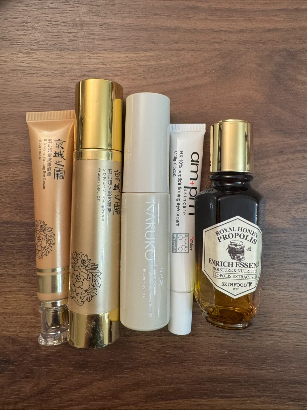 Bundle of skincare products including SKINFOOD Royal Honey Propolis Enrich Essence and NARUKO Taiwan Magnolia Brightening and Firming Serum. Also includes Ample:N RX 10% peptide firming eye cream, 5-D Power V Firming Serum, and 5-D Super Firming Eye Cream. Items vary in size and packaging.