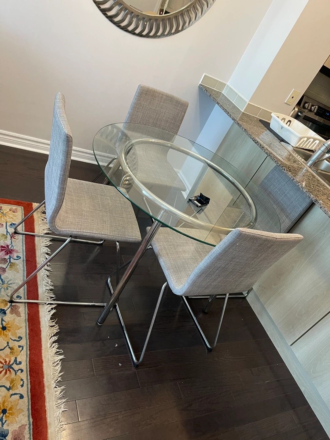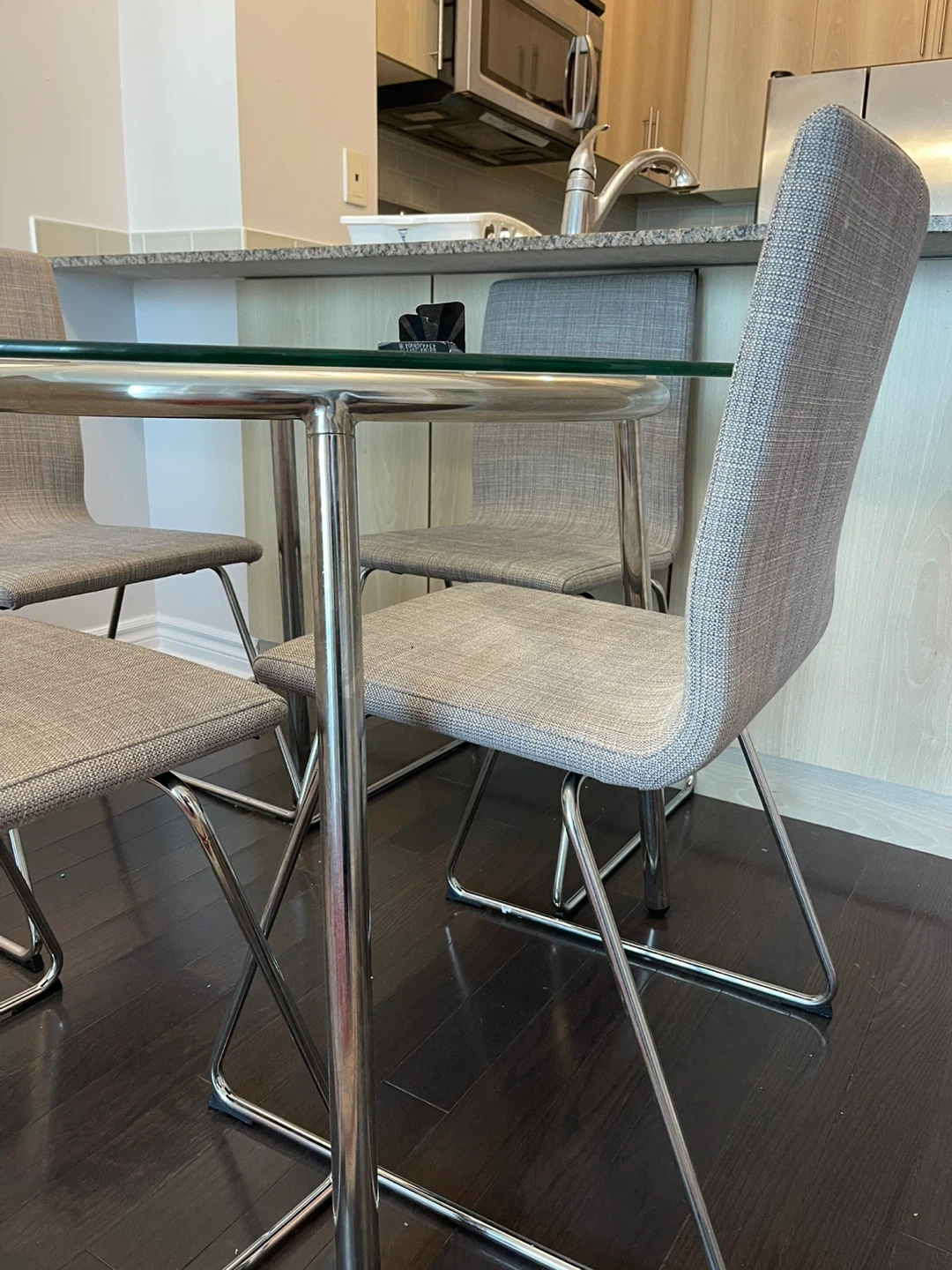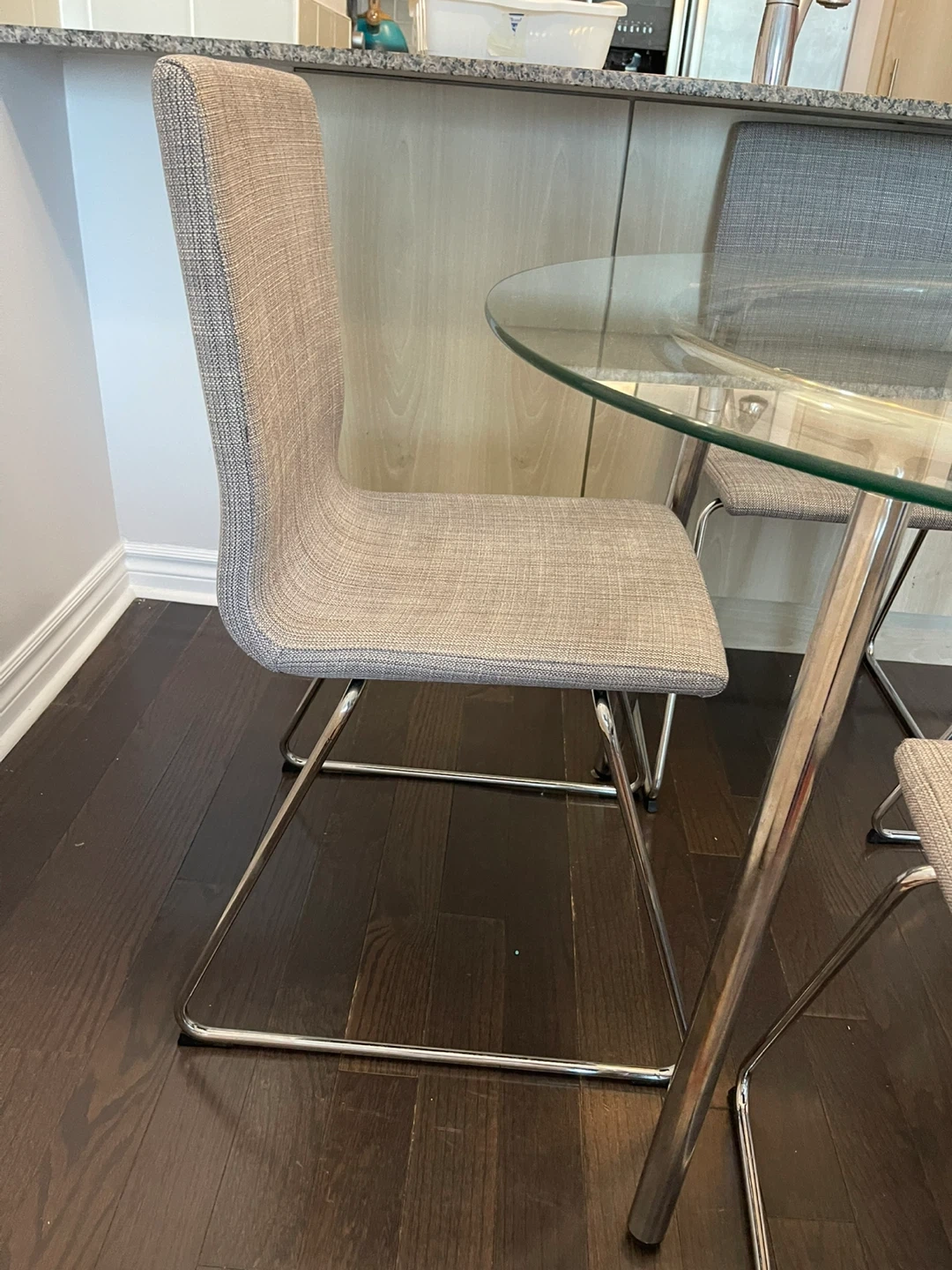 Set of four upholstered dining chairs with a grey fabric finish. They feature chrome metal legs for a modern look. Perfect for a kitchen or dining area.