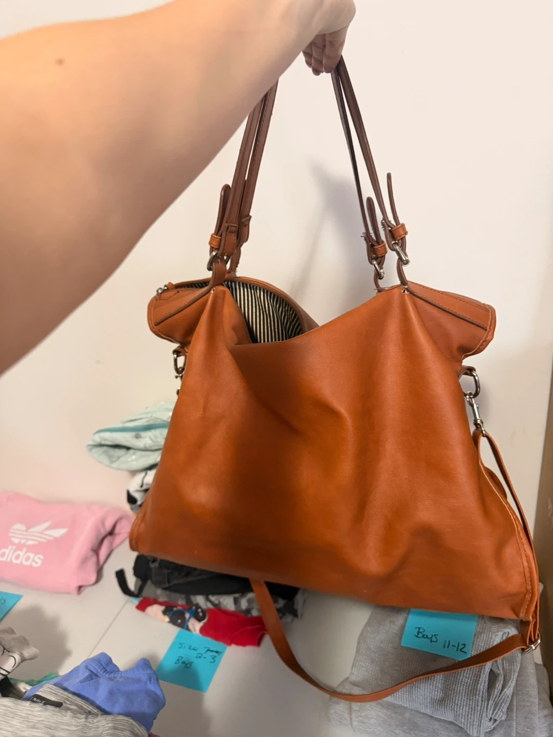 This stylish brown faux leather shoulder bag has a striped interior lining. It features multiple zippered pockets for organization. A versatile bag for everyday use!