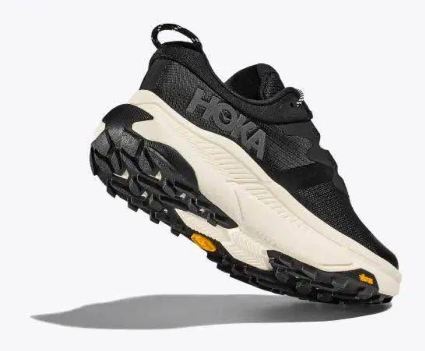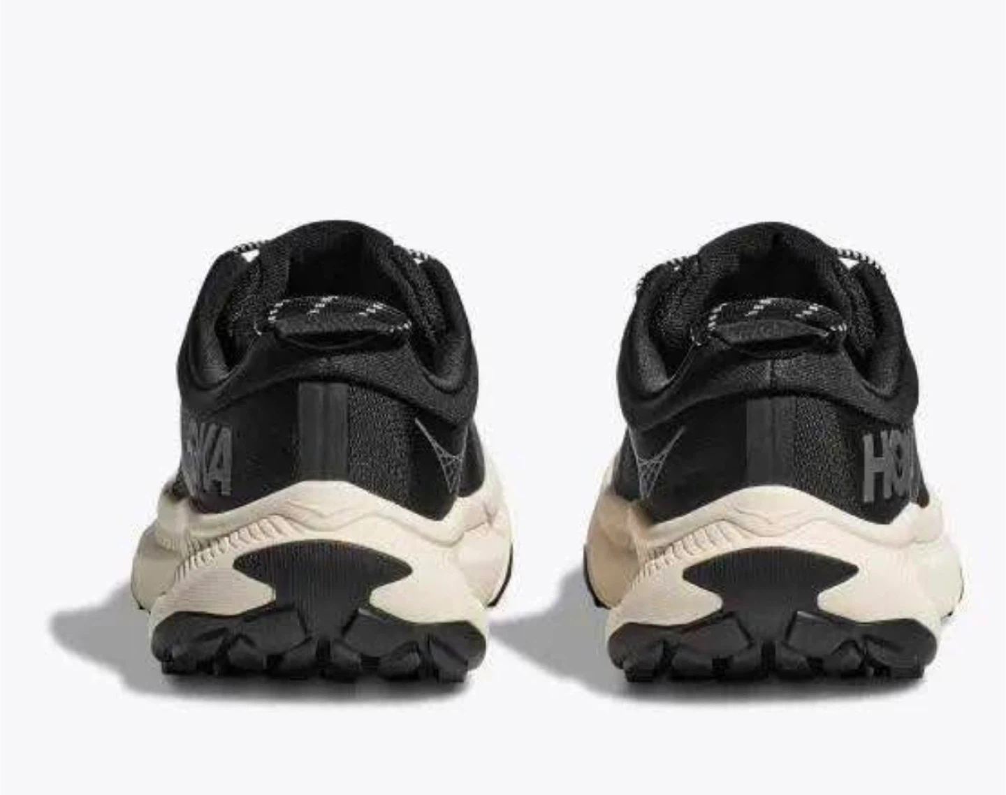 These Hoka trail running shoes are black with a cream-coloured sole. They feature a speed-lacing system and Vibram outsole for traction. Ideal for hitting the trails!