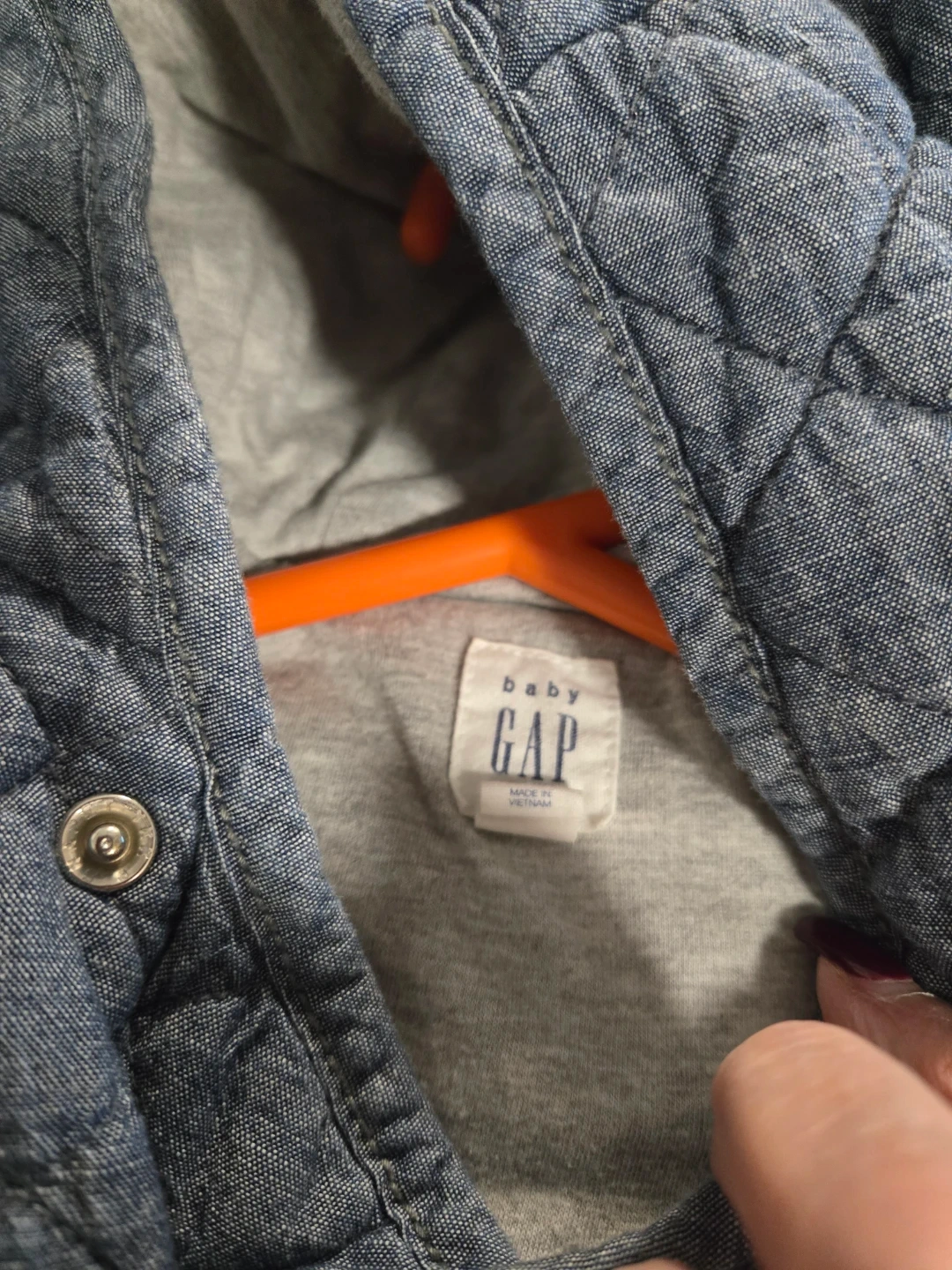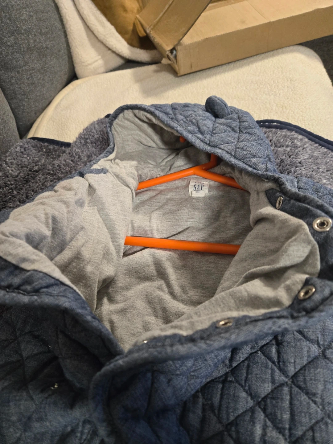 Here's a cozy quilted denim pram suit from Baby Gap! It's in great condition and perfect for keeping your little one warm. The suit features a hood and snap closures for easy dressing. Great for outings!